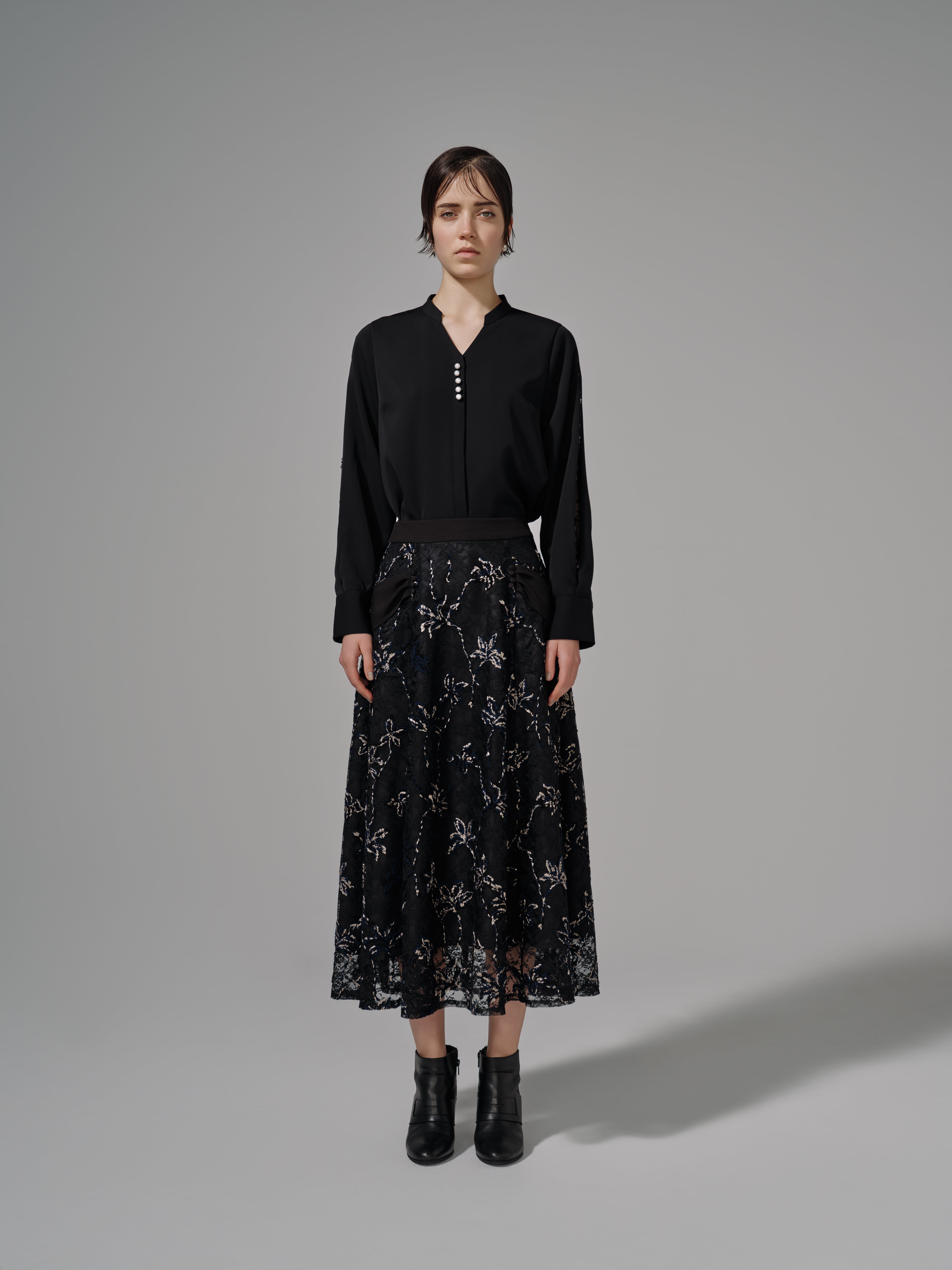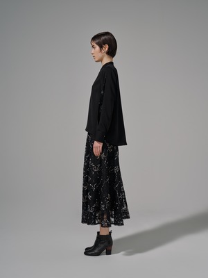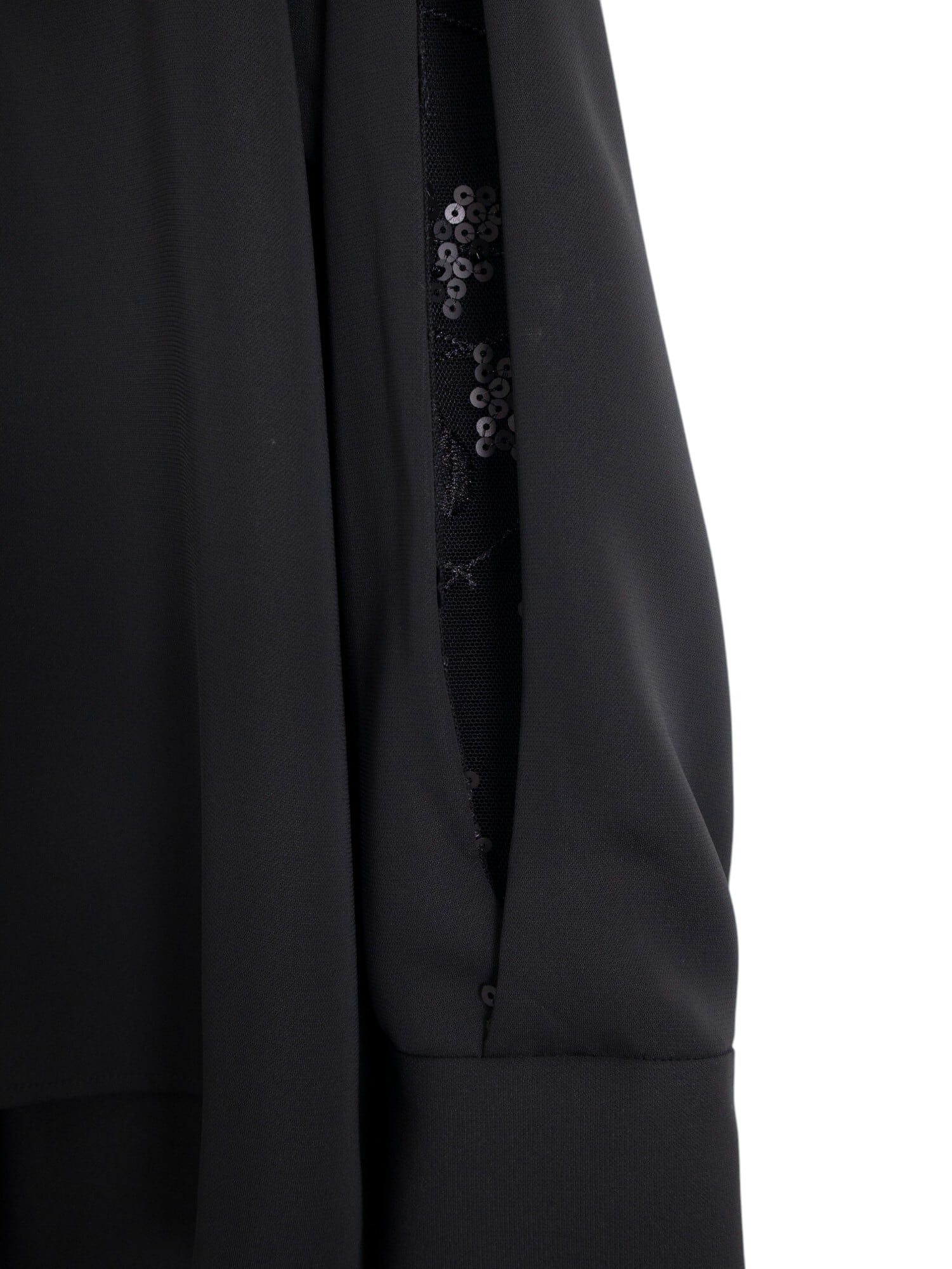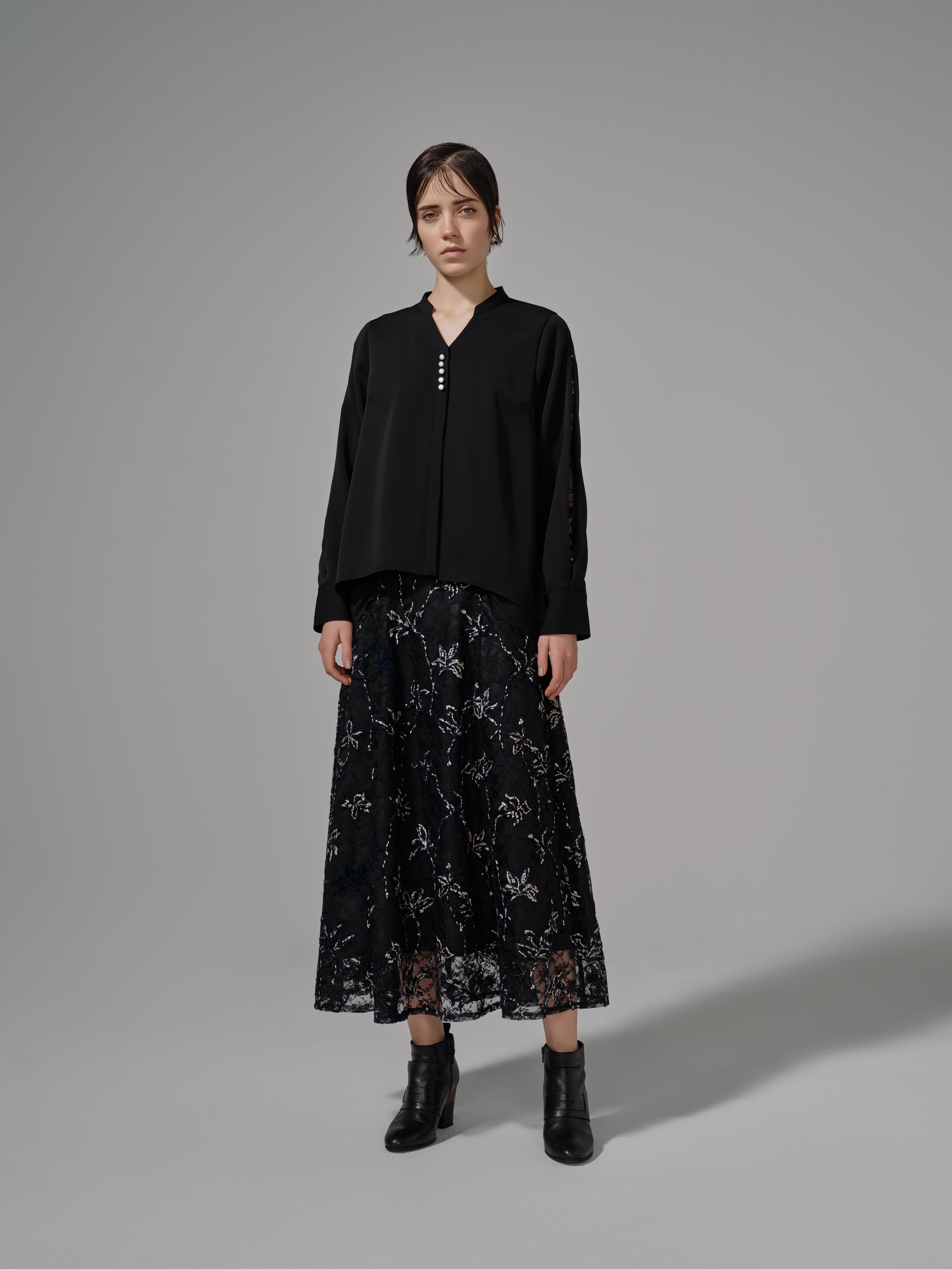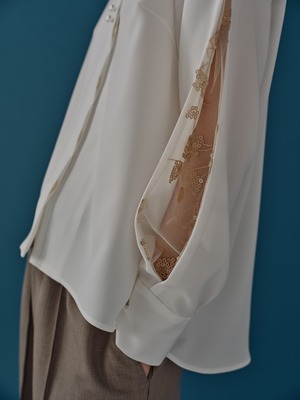 袖にはスパンコールをあしらったチュールの切り替えを施し、さりげない華やかさと軽やかな抜け感を。