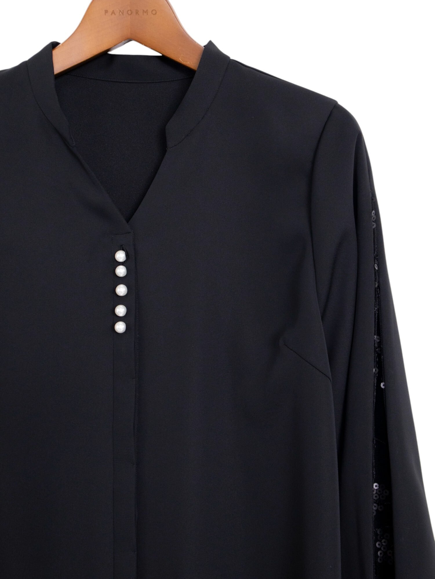 シャープな印象のVネックと、それを引き立てるパール装飾が、デコルテラインを美しく見せてくれます。