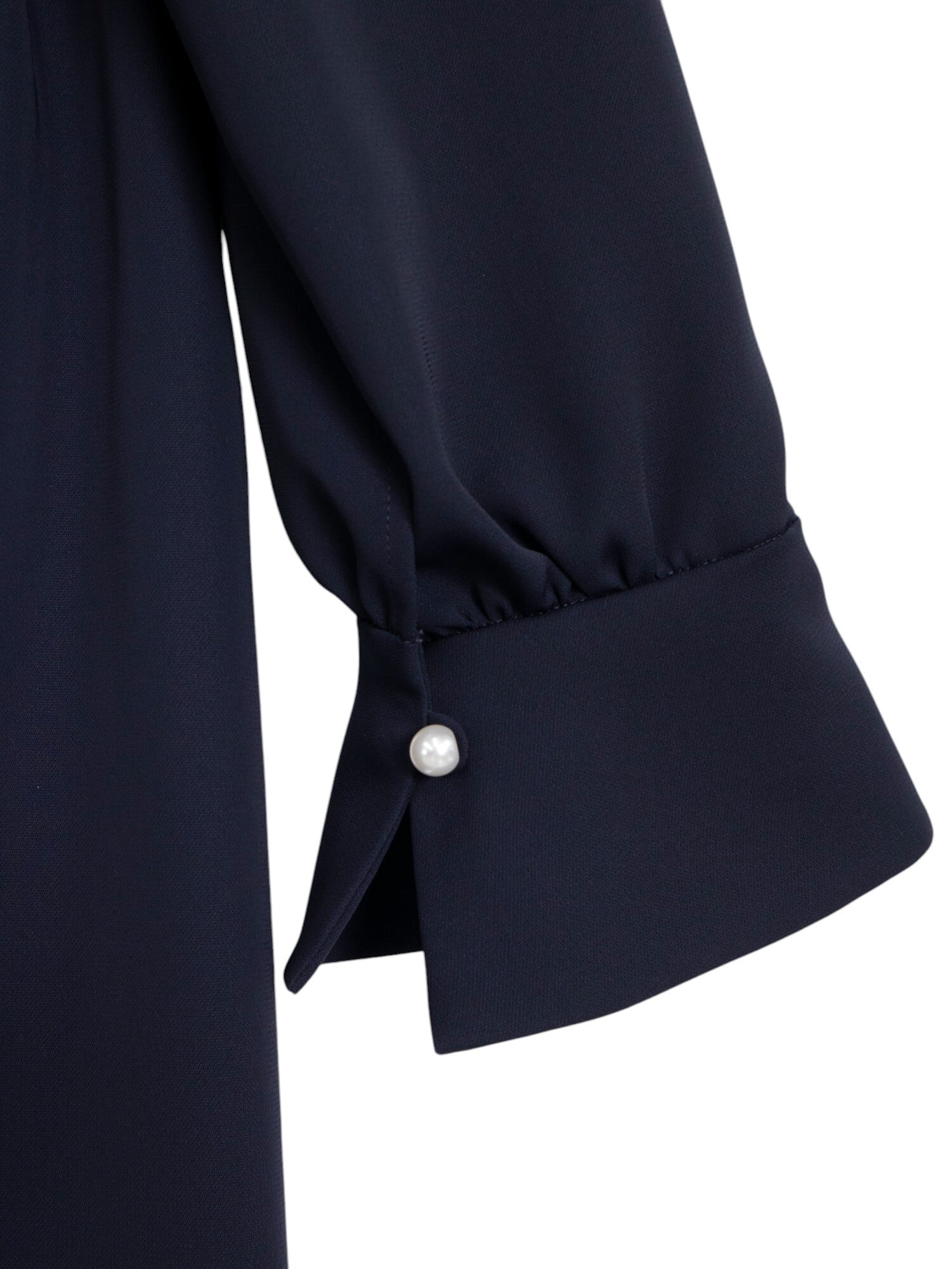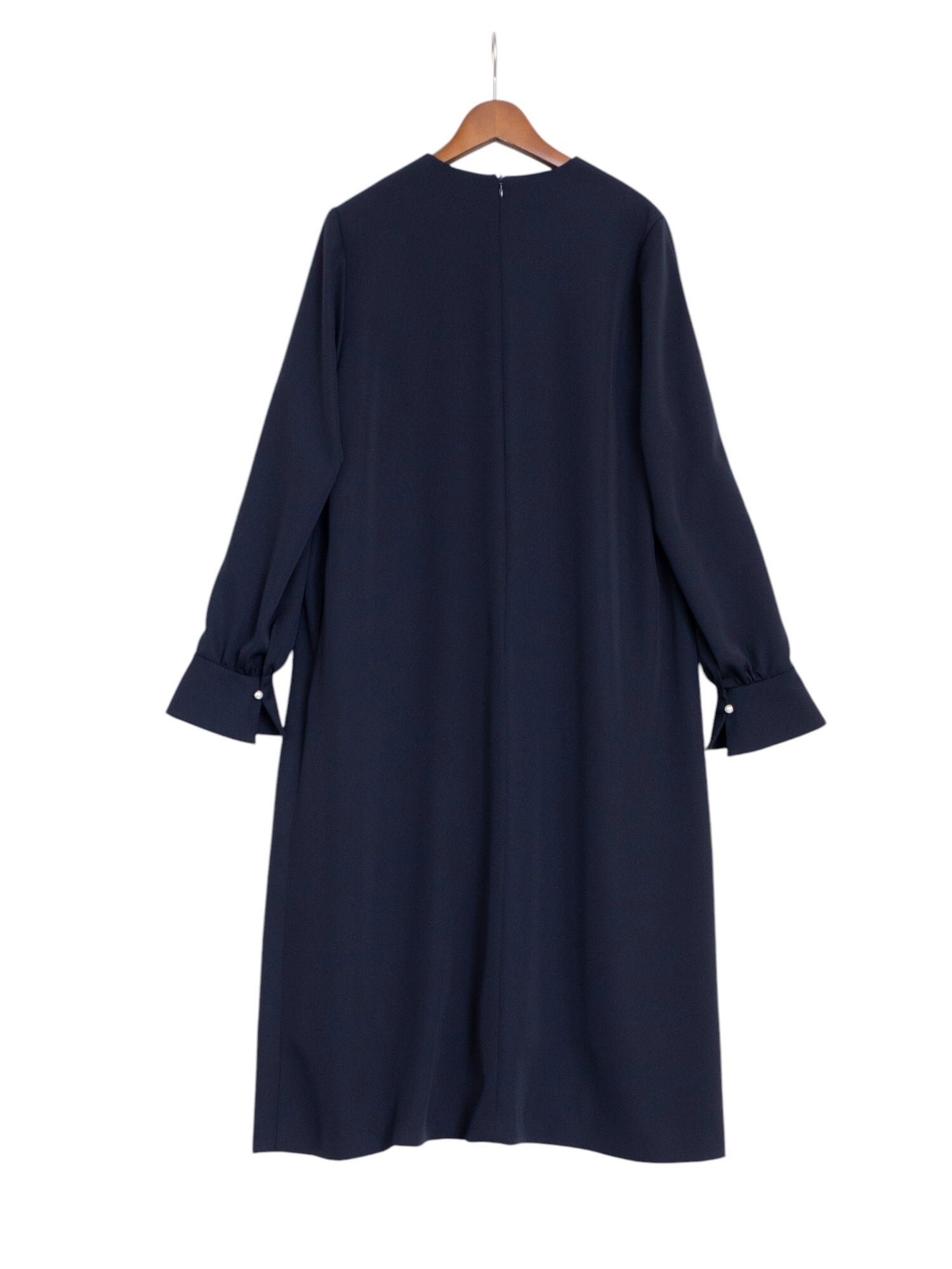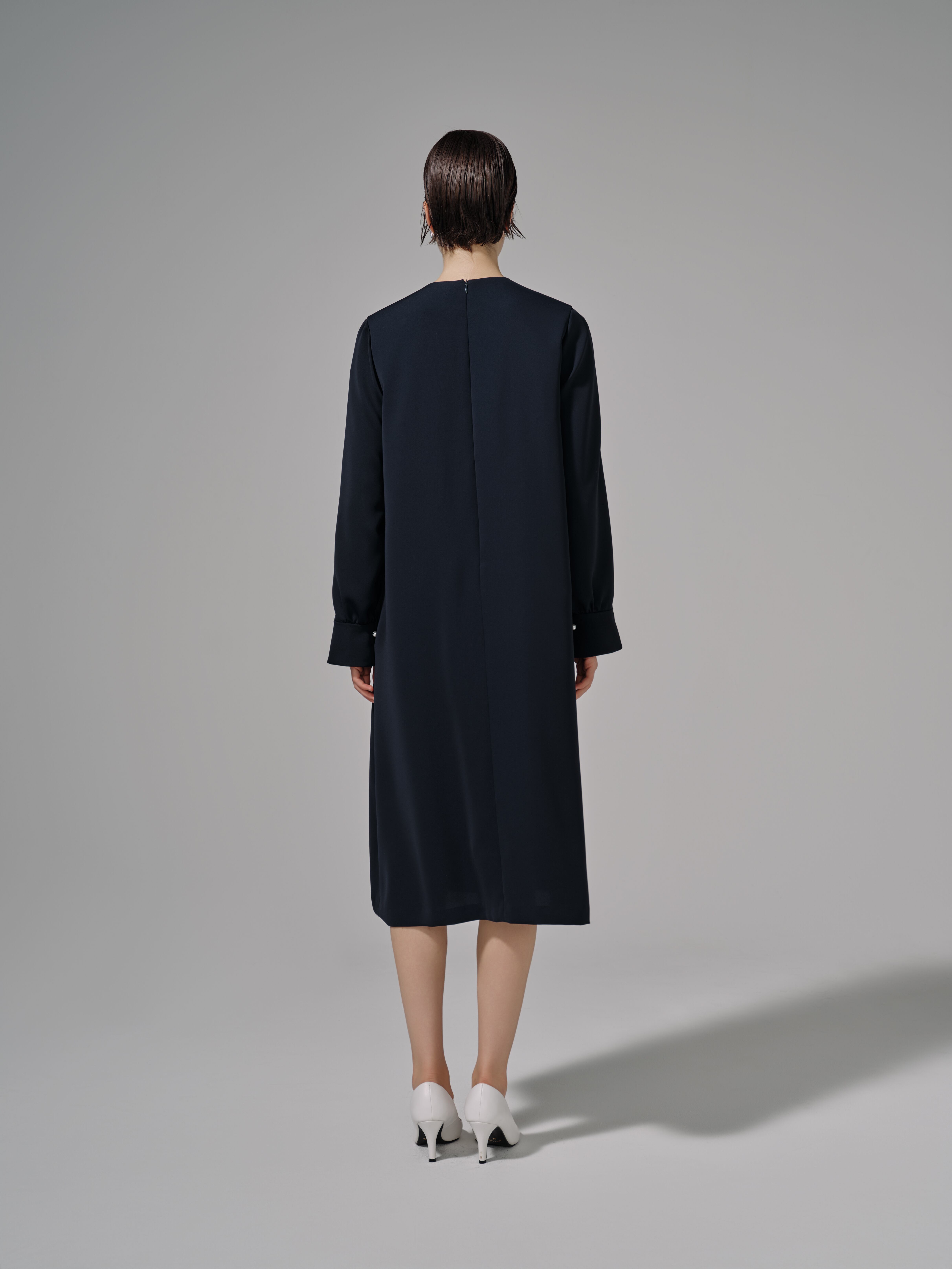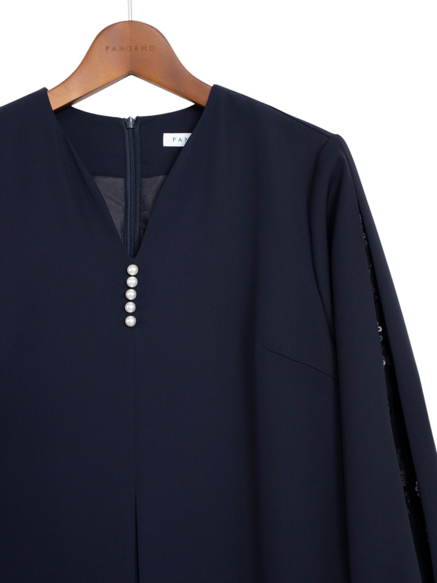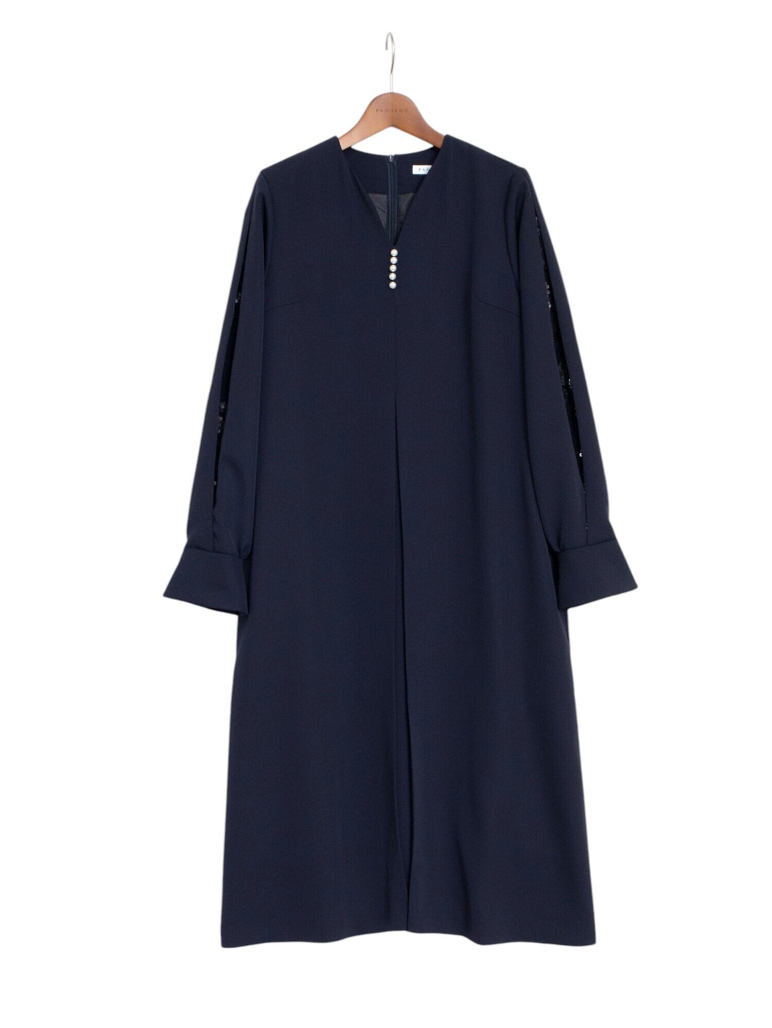 カーブを描く襟元、パールの装飾、着る人の美しさを引き立てる一枚です。