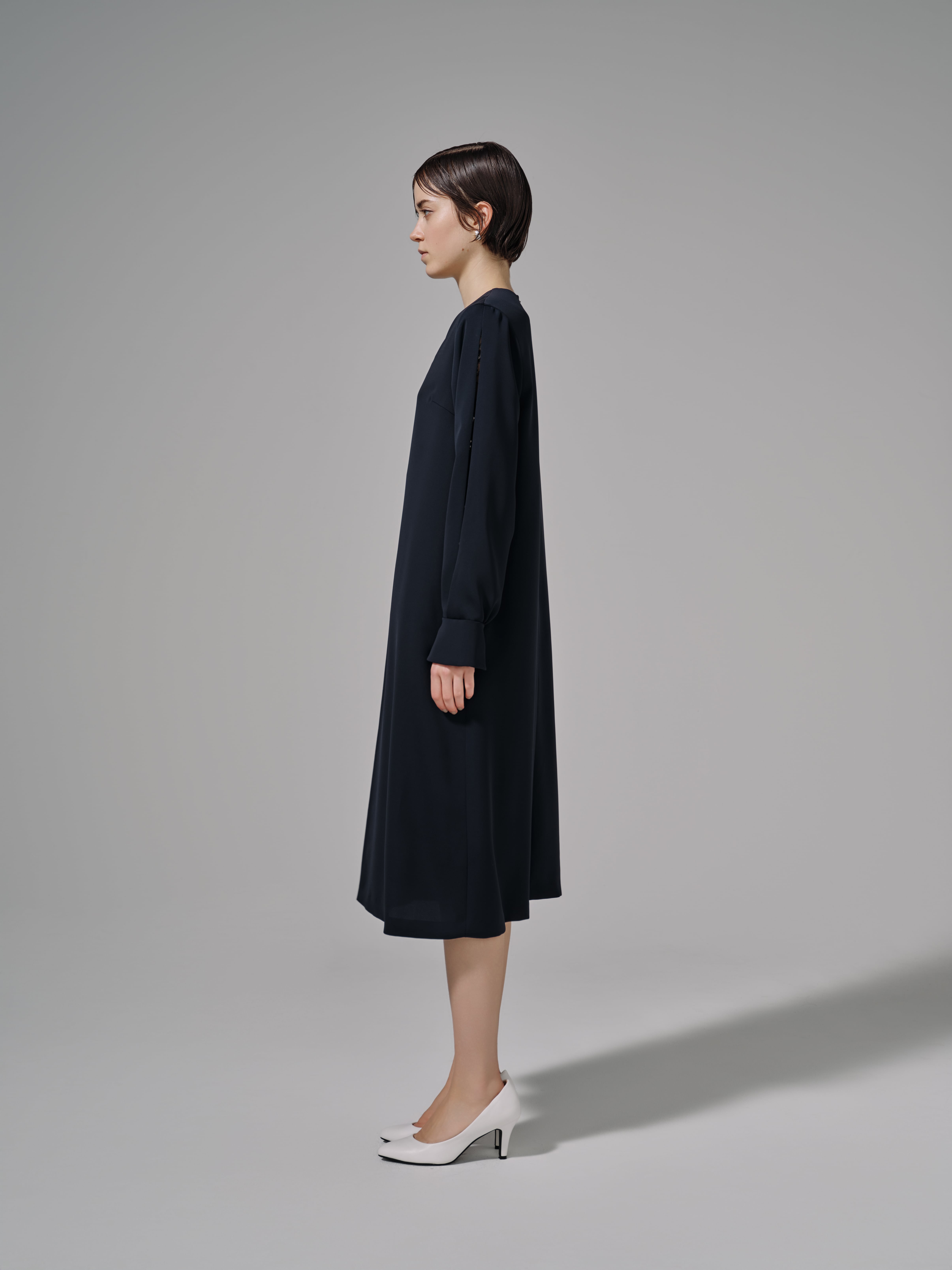 ウエストから裾へのボックスプリーツは縦のIラインを強調し、体のラインを拾わずすっきりと着用いただけます。
