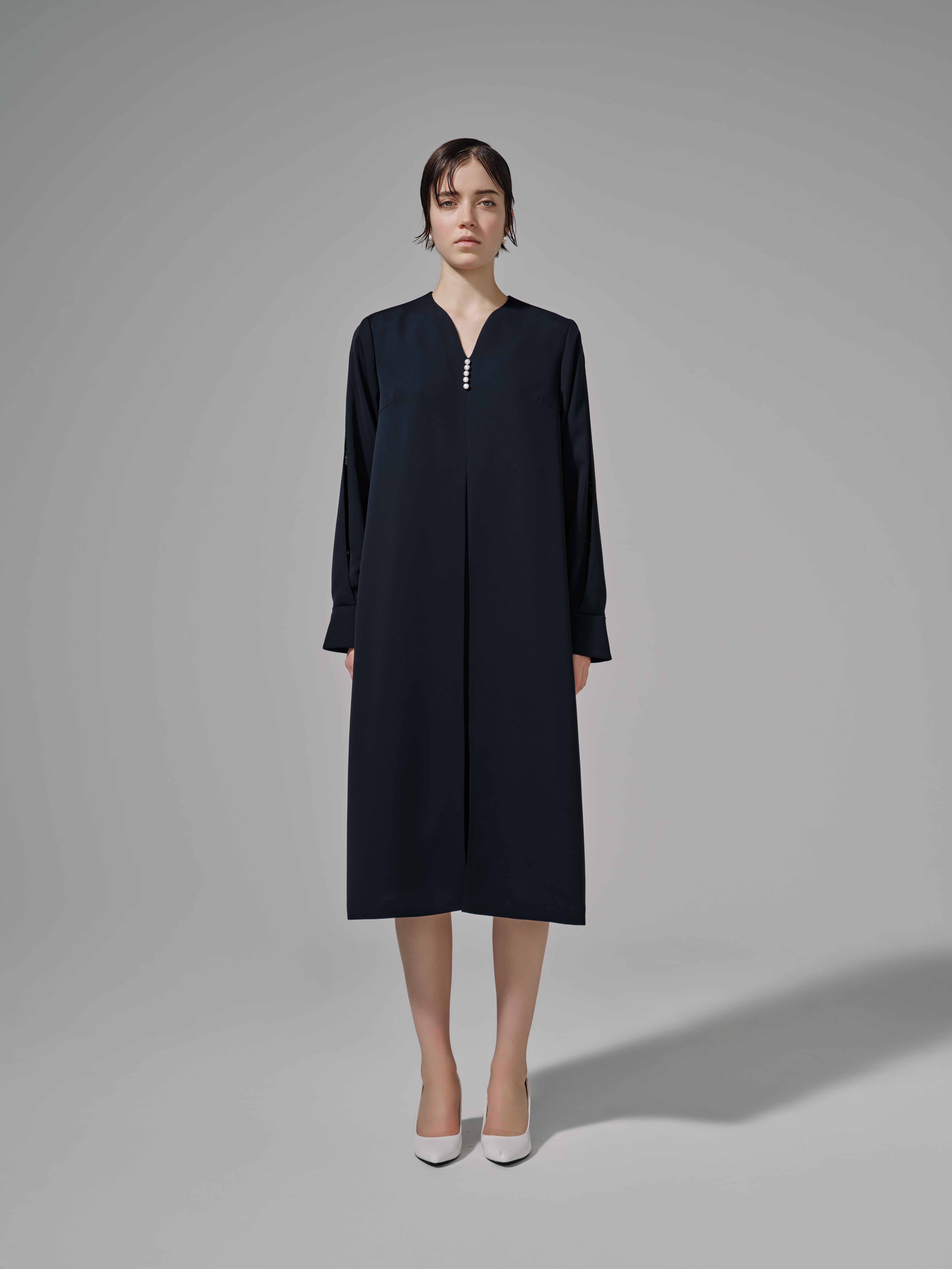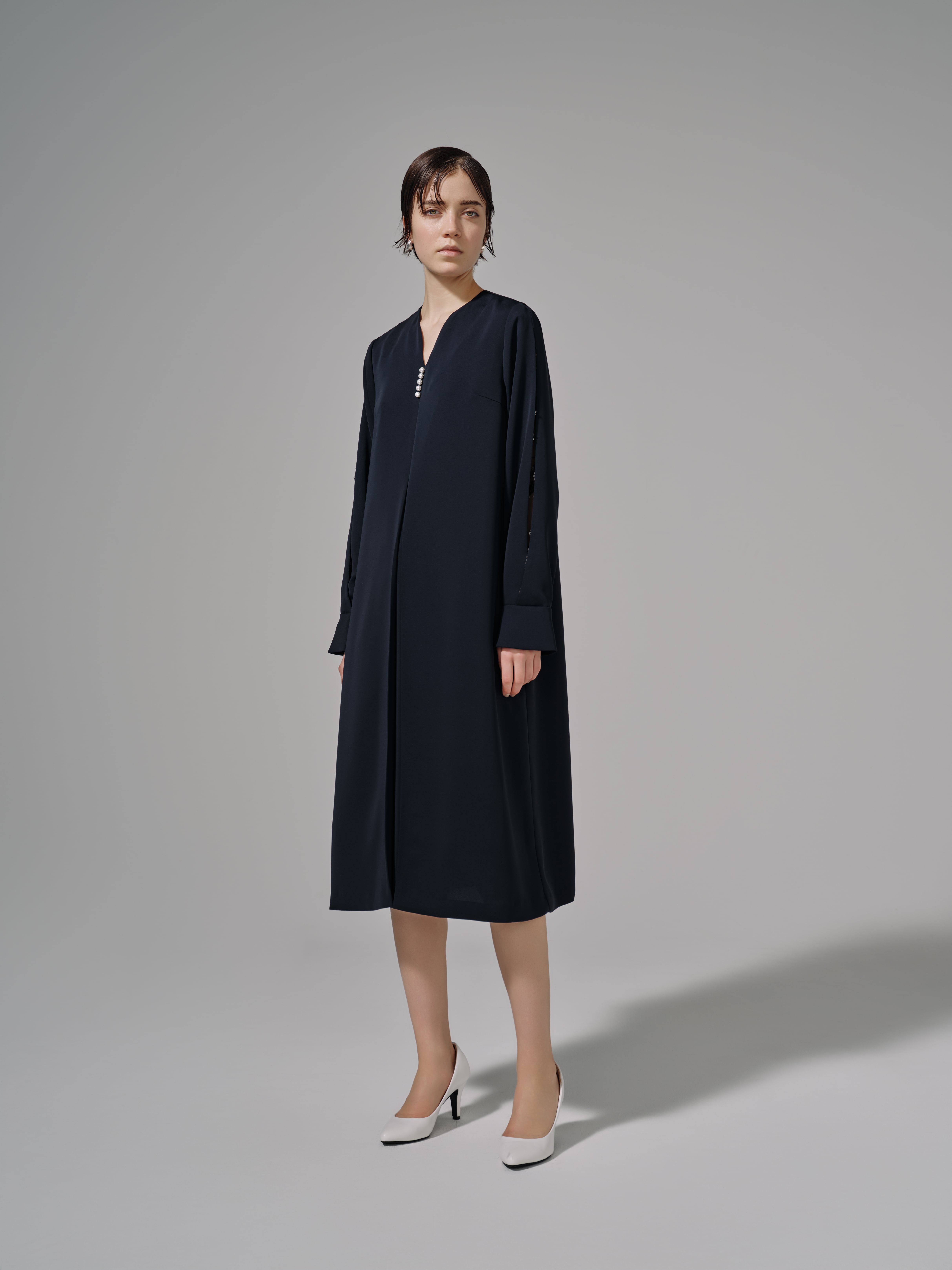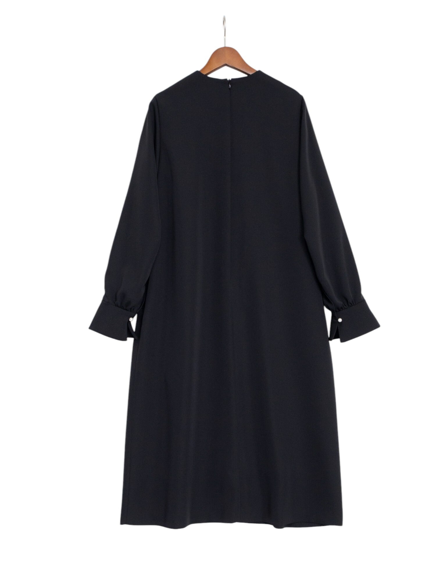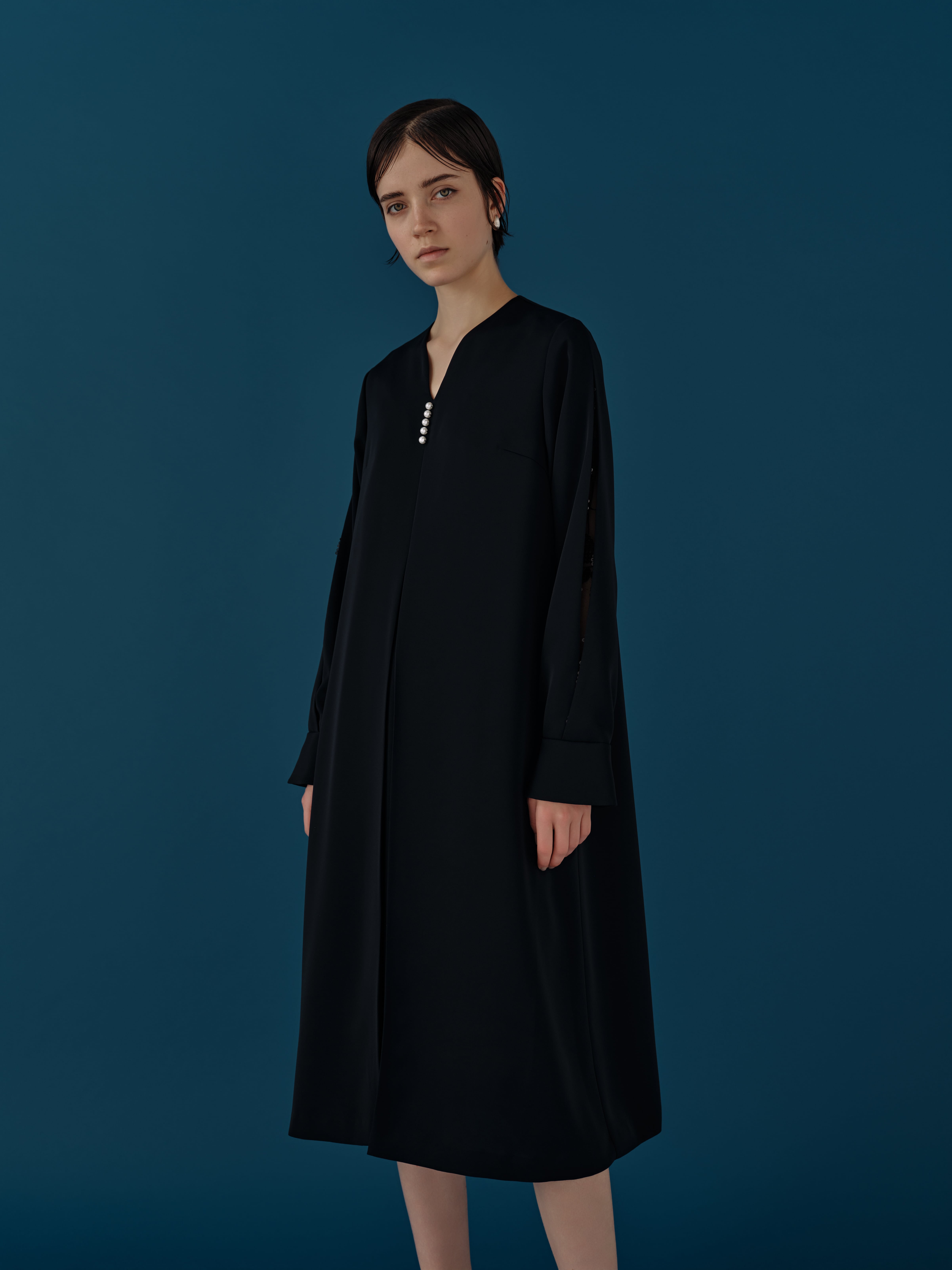 カーブを描く襟元、パールの装飾、着る人の美しさを引き立てる一枚です。