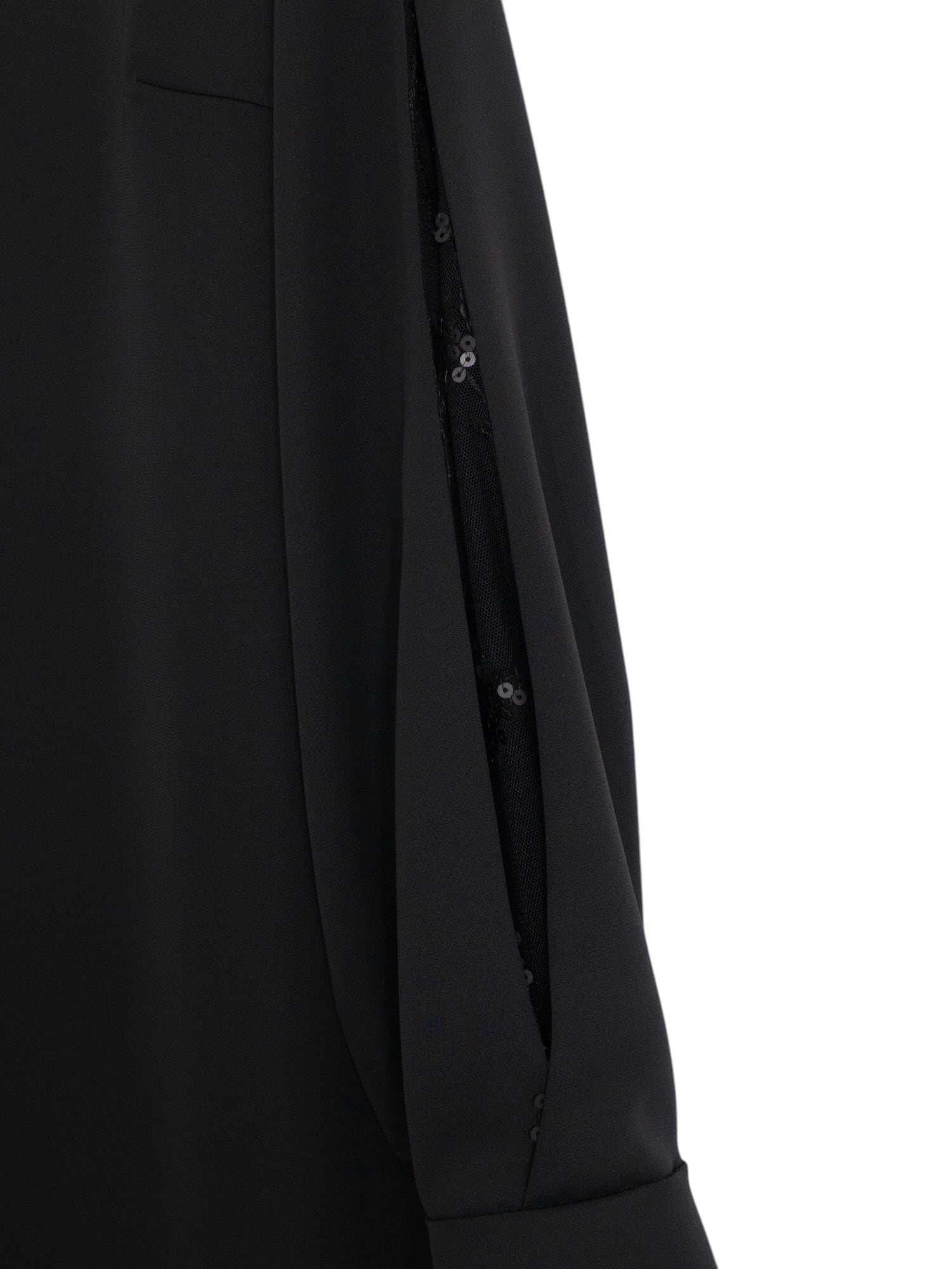 袖にはスパンコールをあしらったチュールの切り替えを入れ、さりげない華やかさと軽やかな抜け感を。