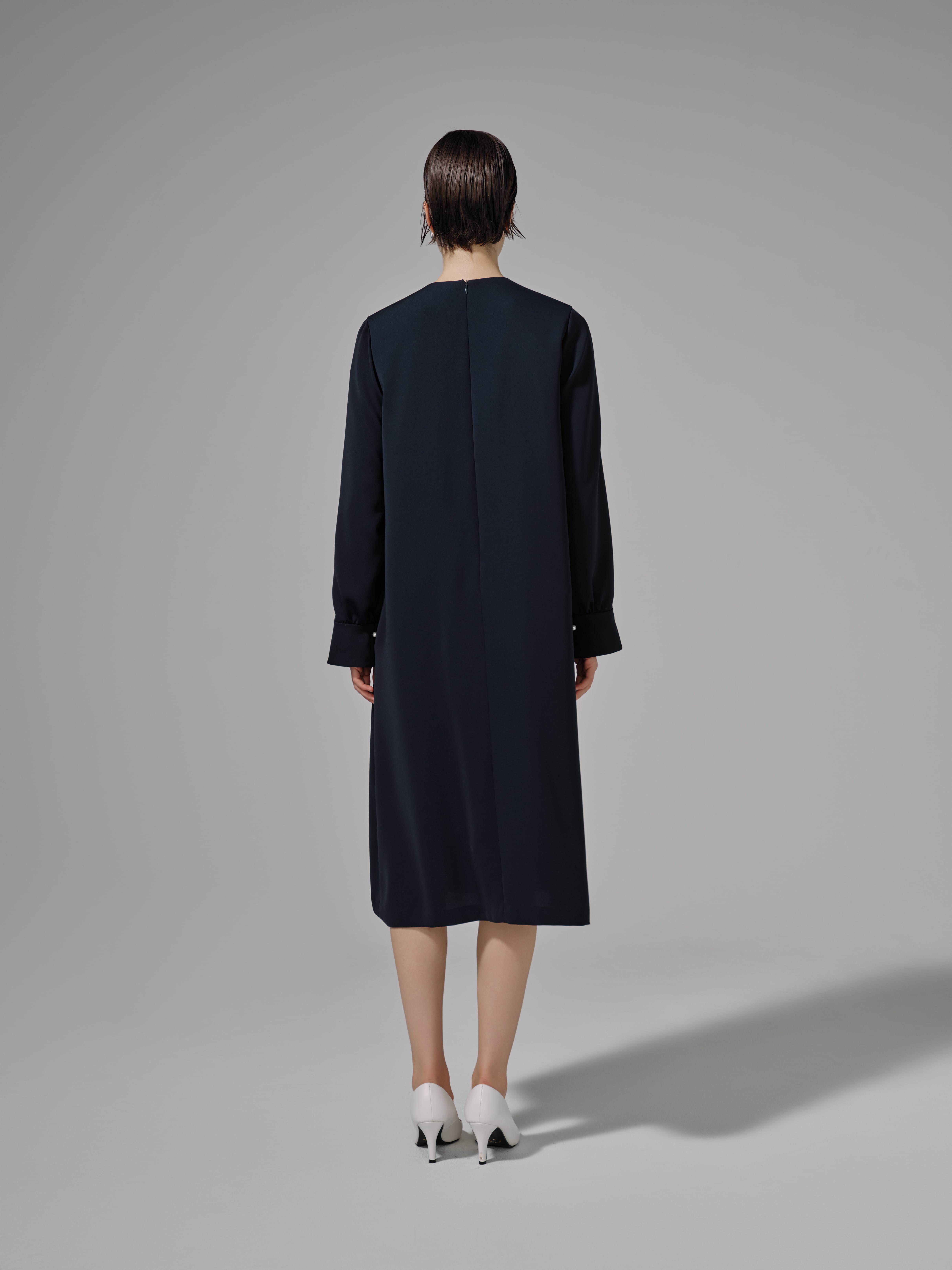 ウエストから裾へのボックスプリーツは縦のIラインを強調し、体のラインを拾わずすっきりと着用いただけます。