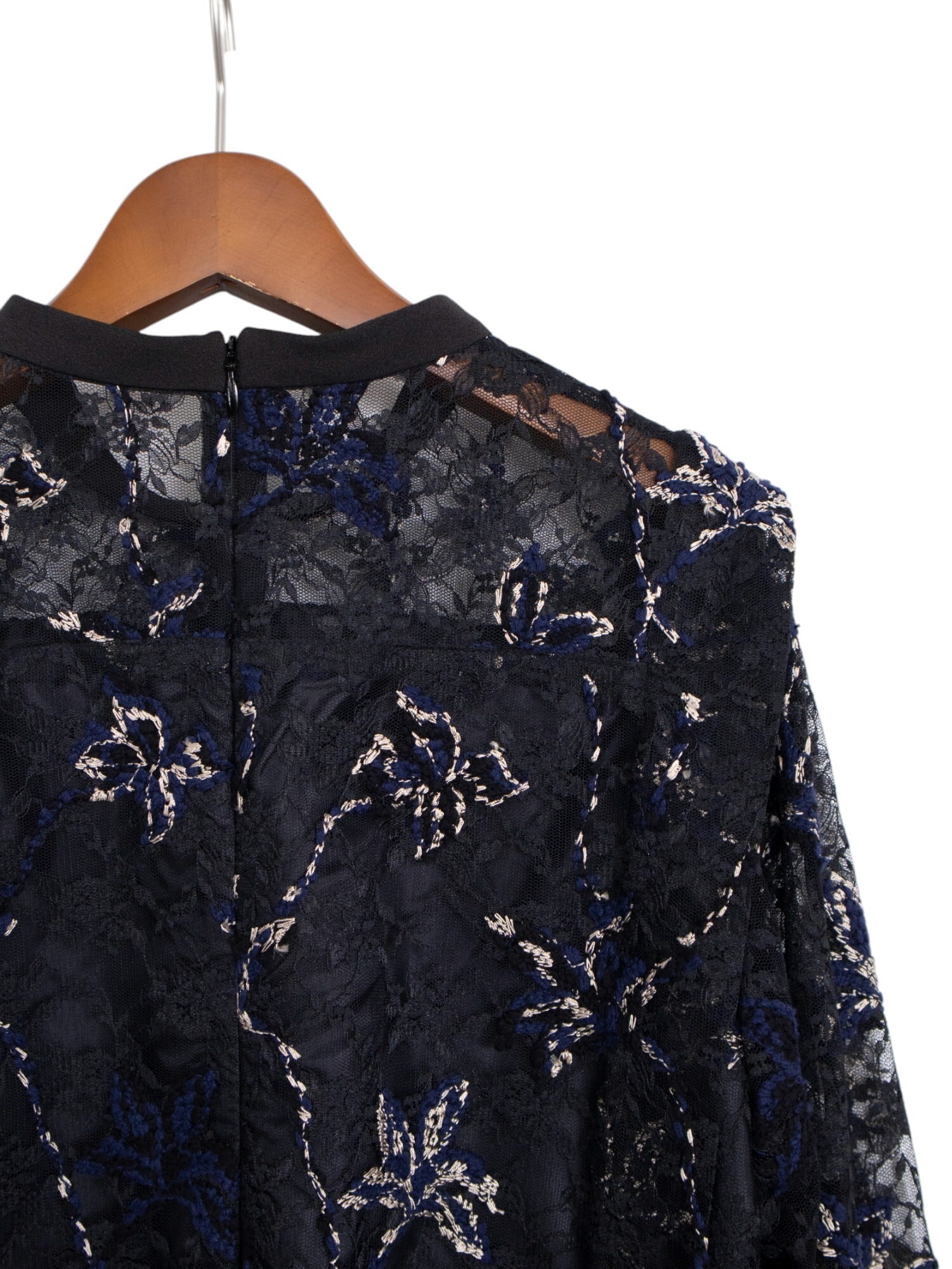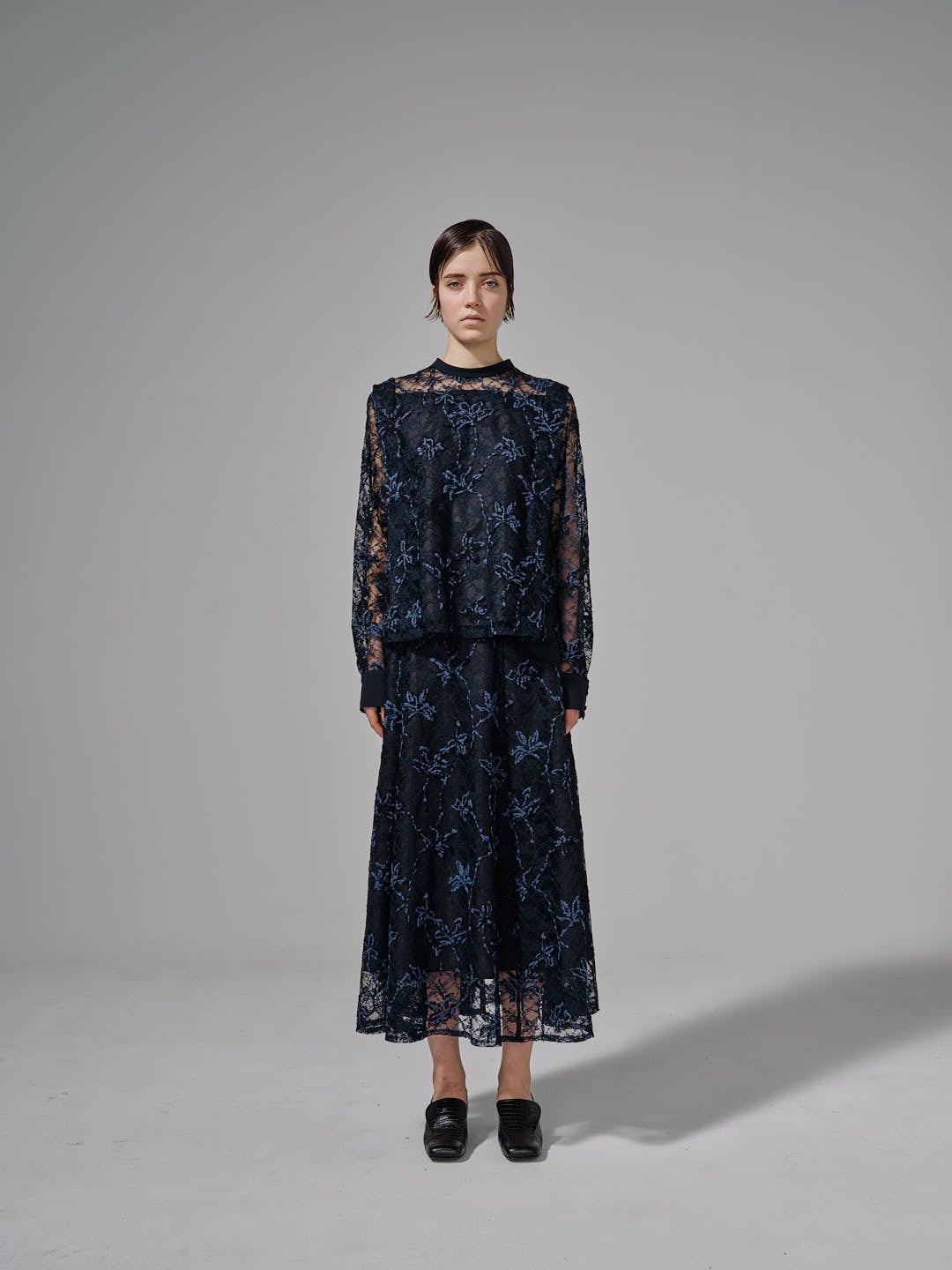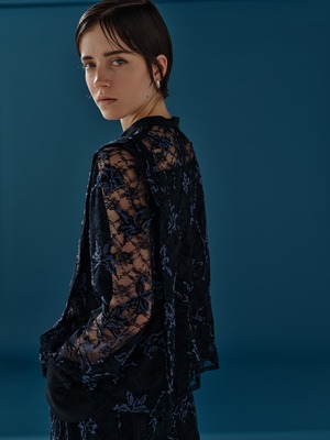一枚で完成するよう裏地を施しつつ、袖と胸元にはレースの透け感を活かし、抜け感をプラス。くるみボタンがアクセントになったカフスもポイントです。同素材の「TWILIGHT FLOWER SKIRT」とセットアップでドレスとしての着用もおすすめです。