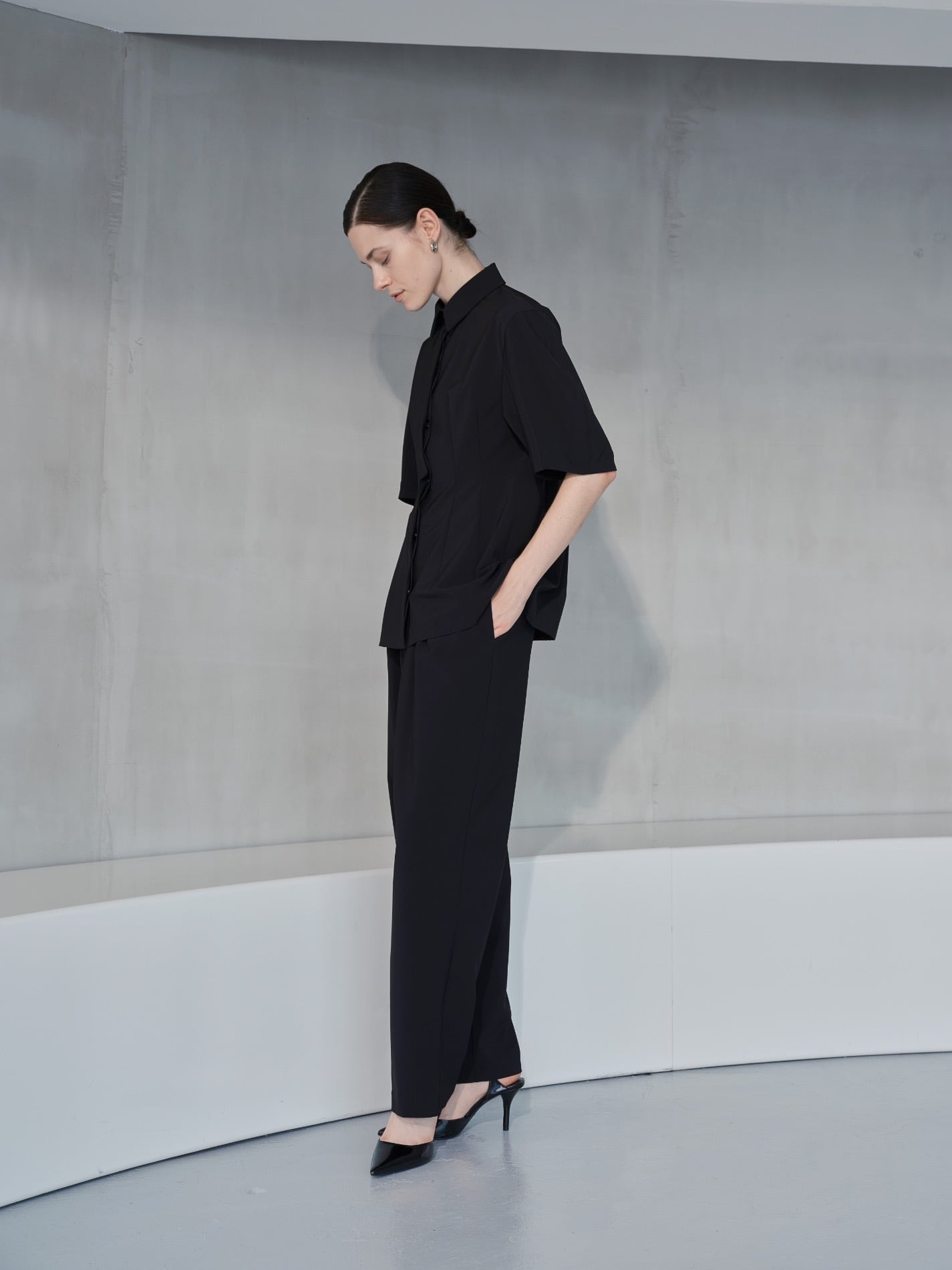ややテーパードのストレートシルエットが脚をスッキリと見せ、美しくレッグラインに引き立てます。