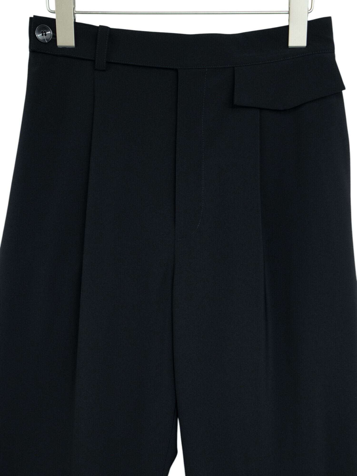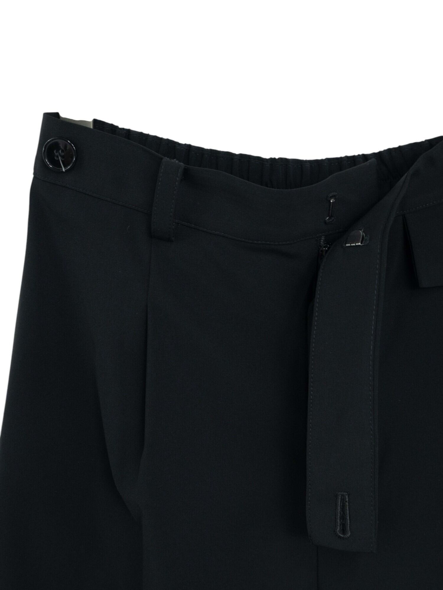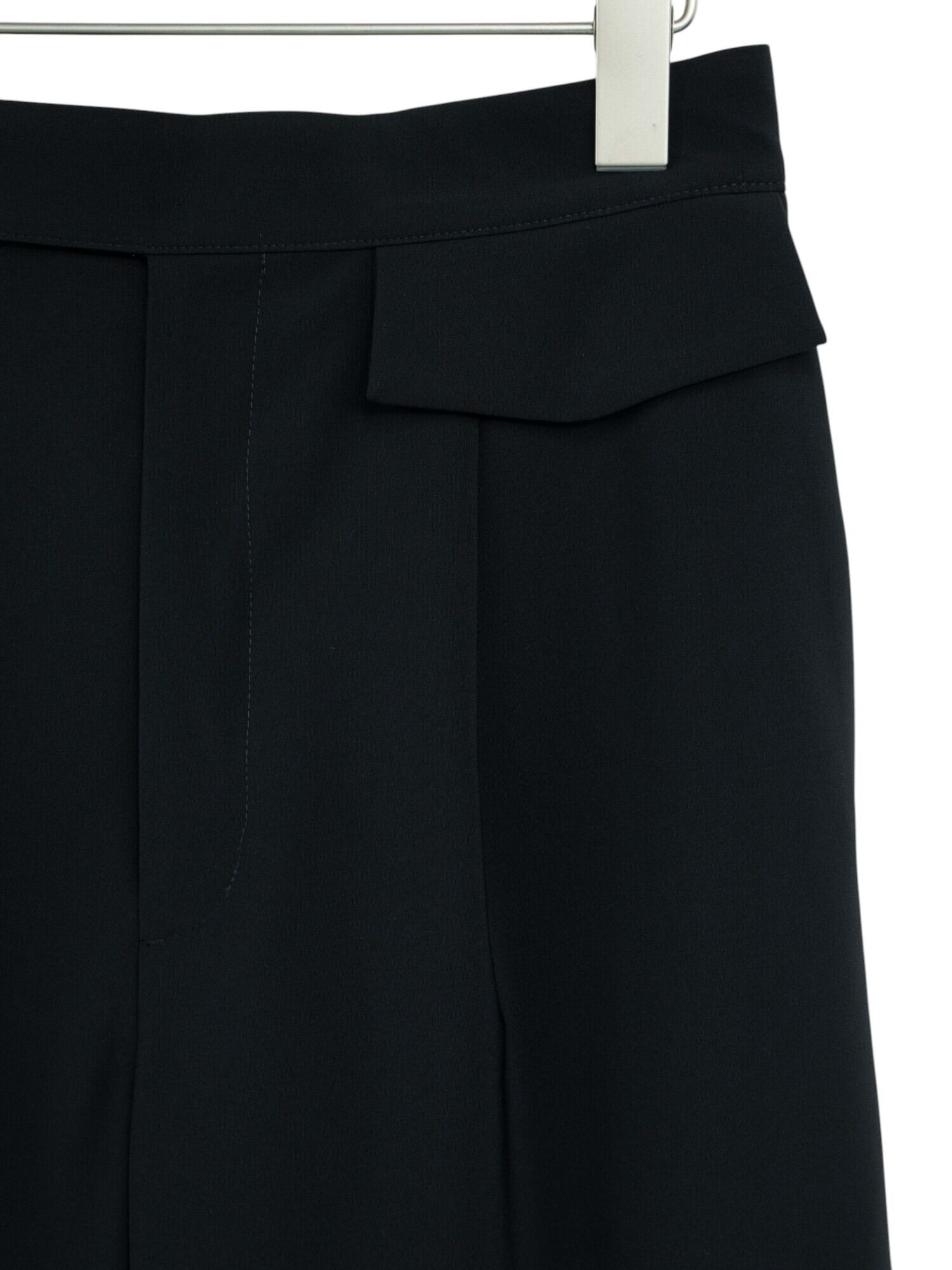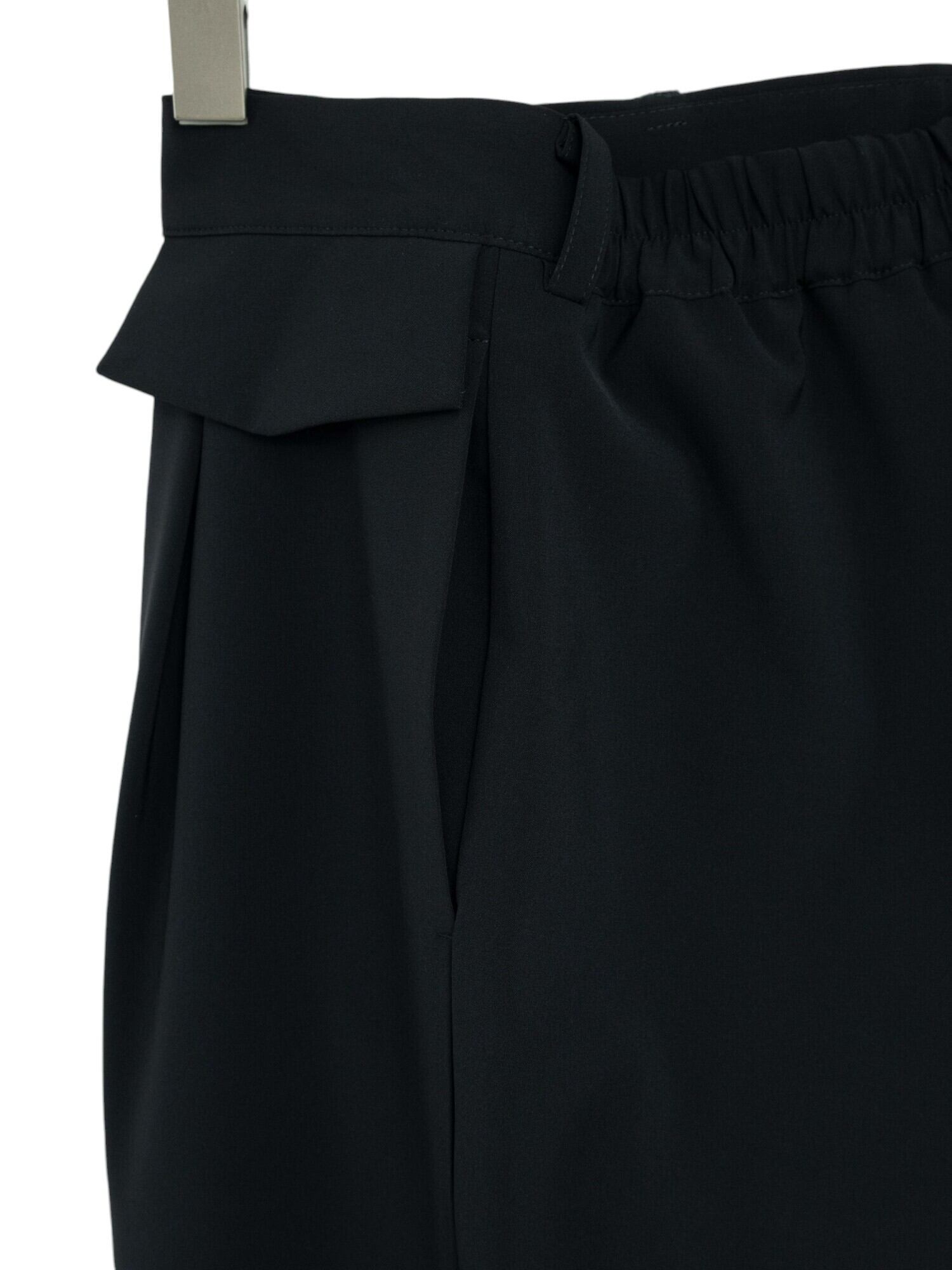 ウエスト部分には、騙しポケットのフラップディテールとベルト風のボタンデザインが施され、シンプルながらもさりげないアクセントをプラス。