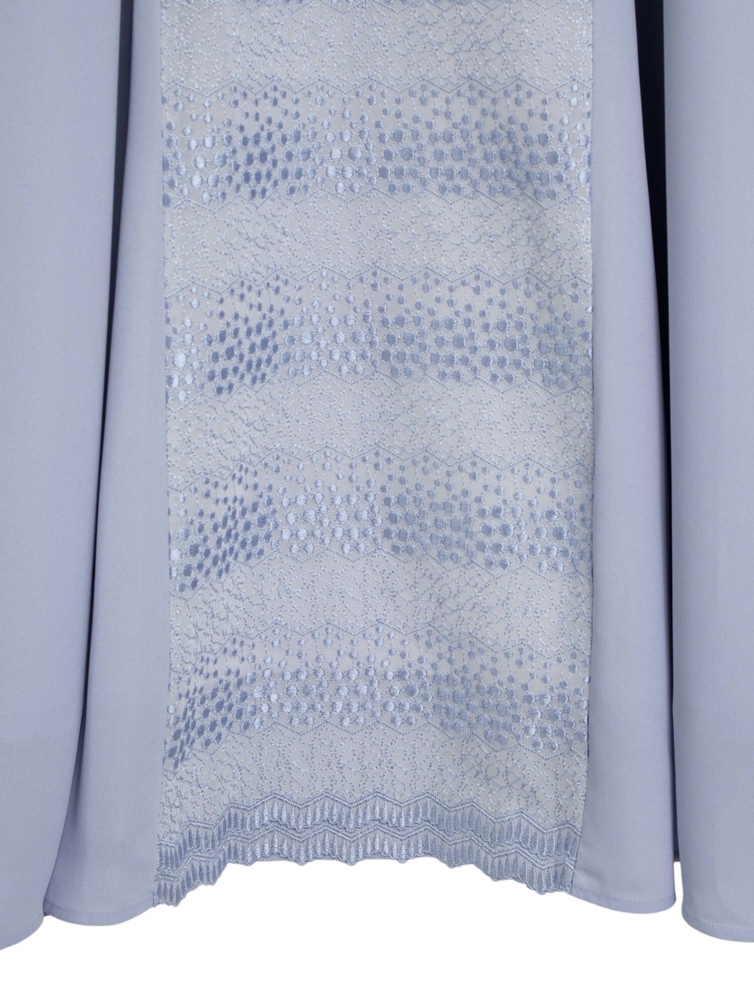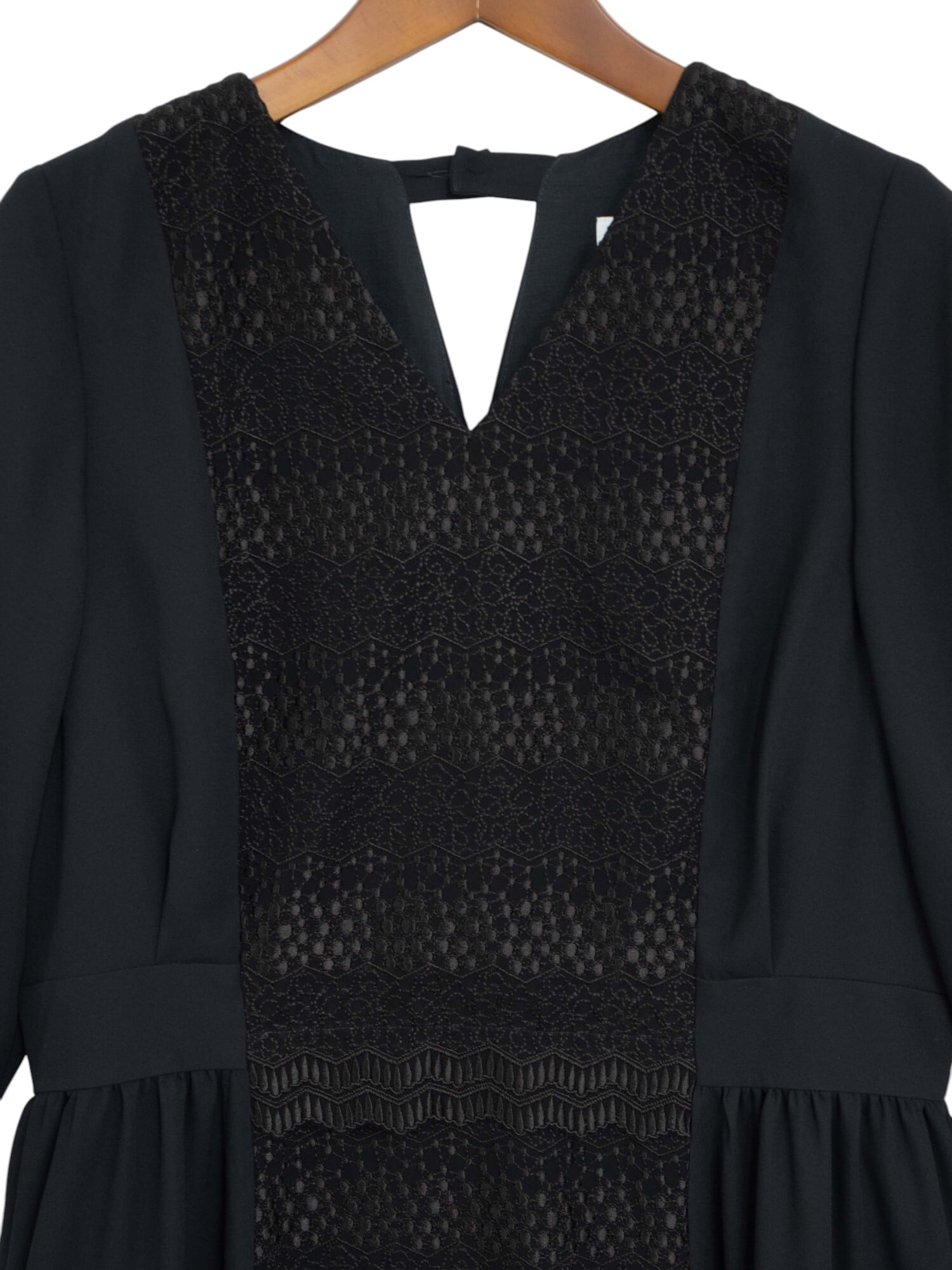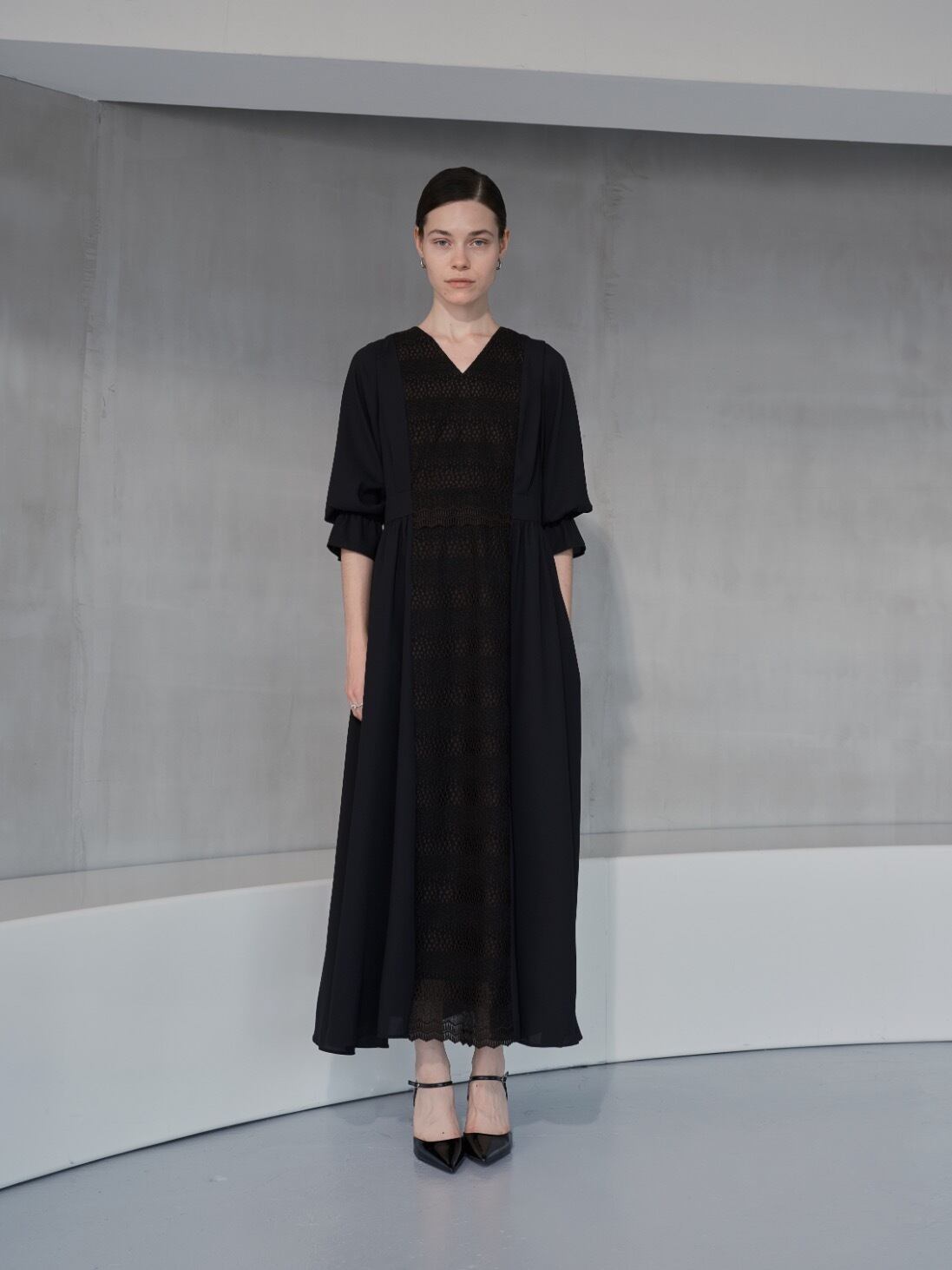 光の粒が折り重なったイメージで製作したオリジナルレースを、フロントにあしらった七分袖ワンピースドレス。