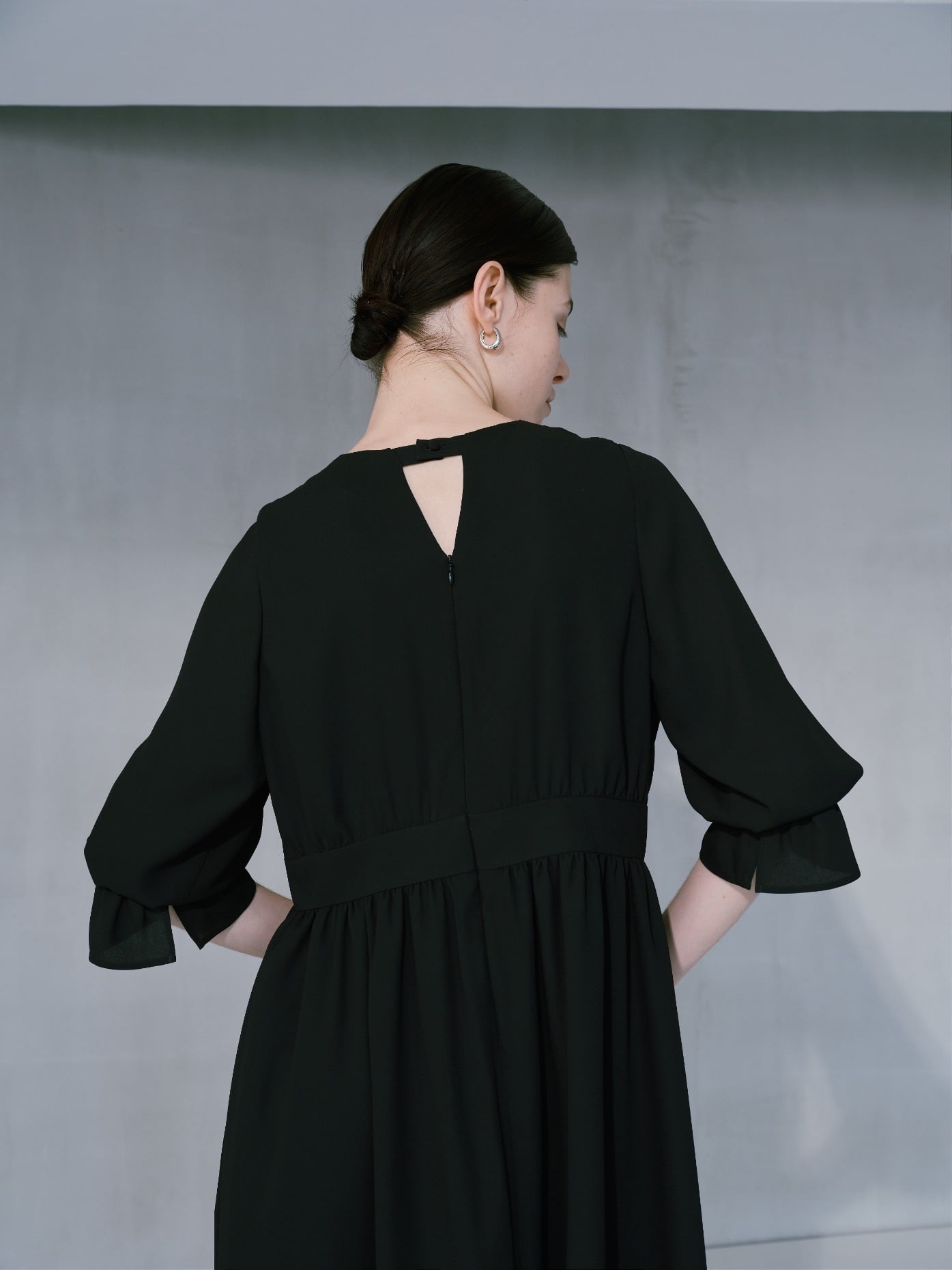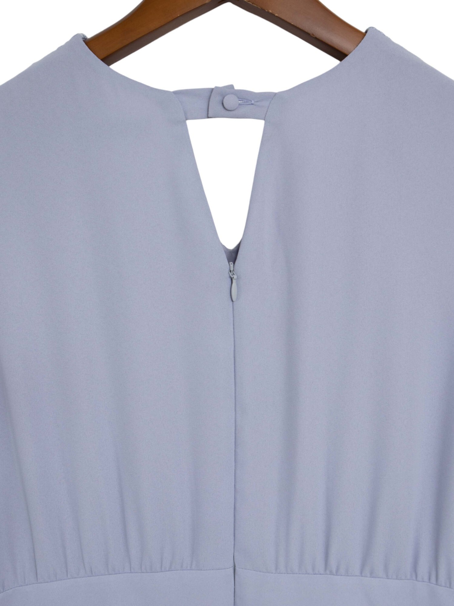 背面の首元の開きデザインと袖口のささやかなスリットが、上品な抜け感を演出します。