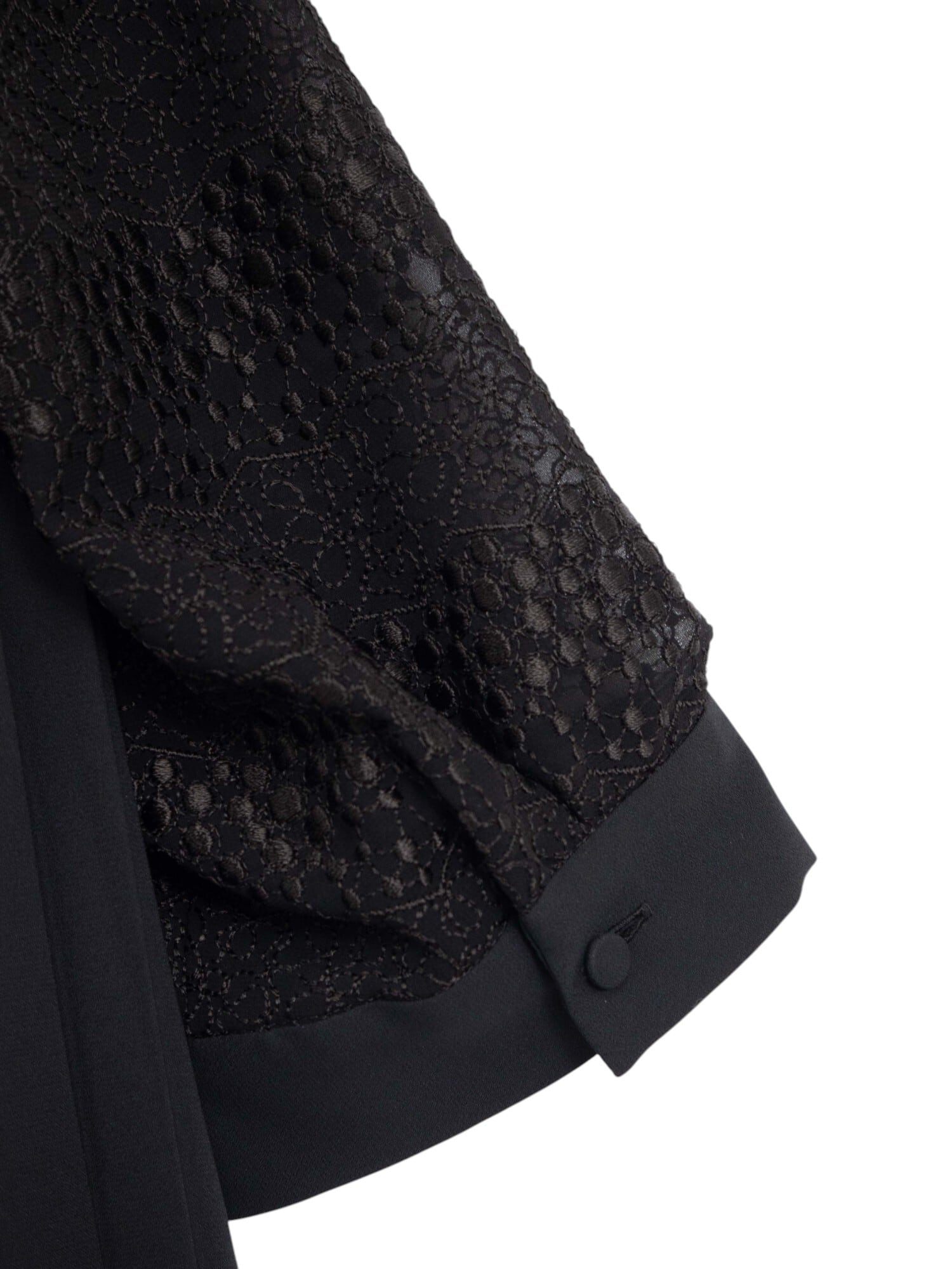 袖と裾には、光の粒が折り重なったイメージで製作したオリジナルレースをあしらい上品なレースの表情を楽しむことができます。