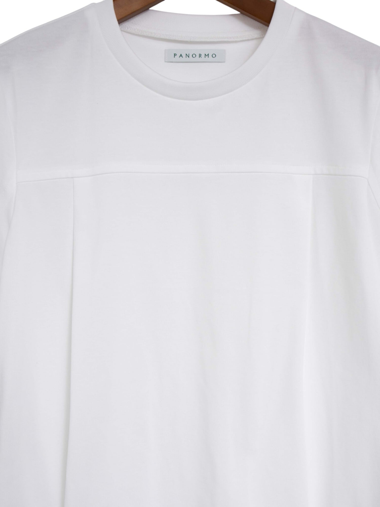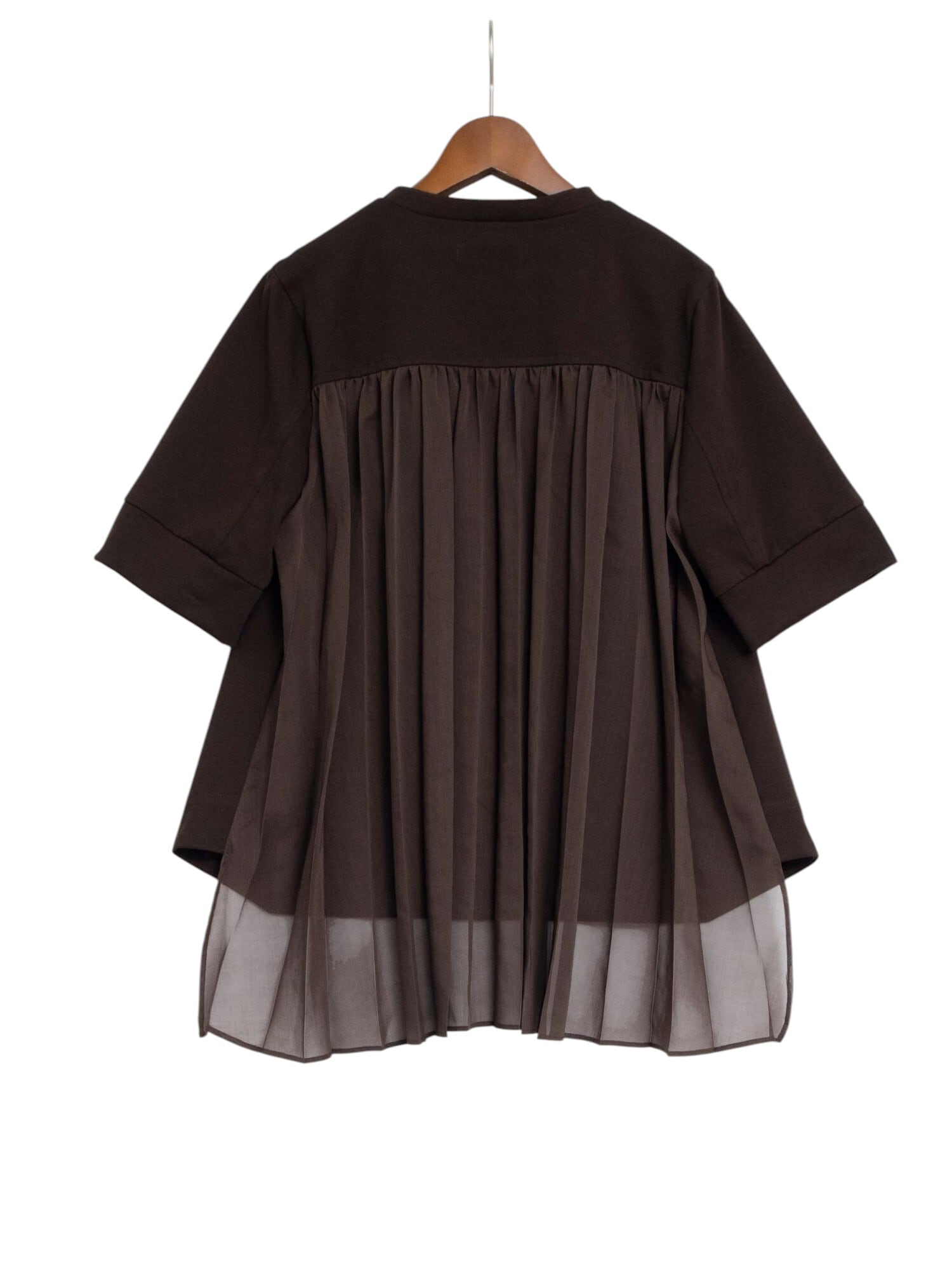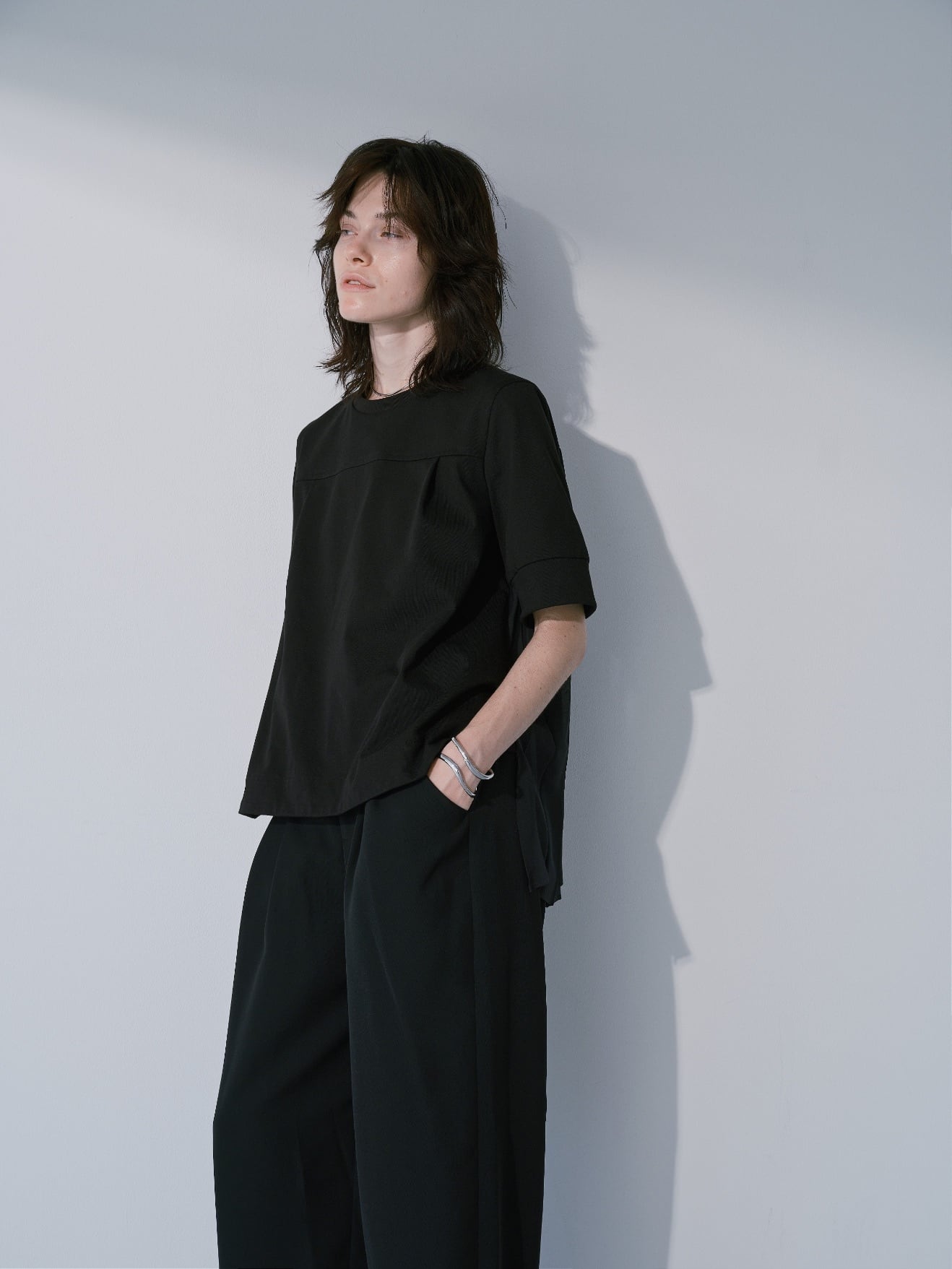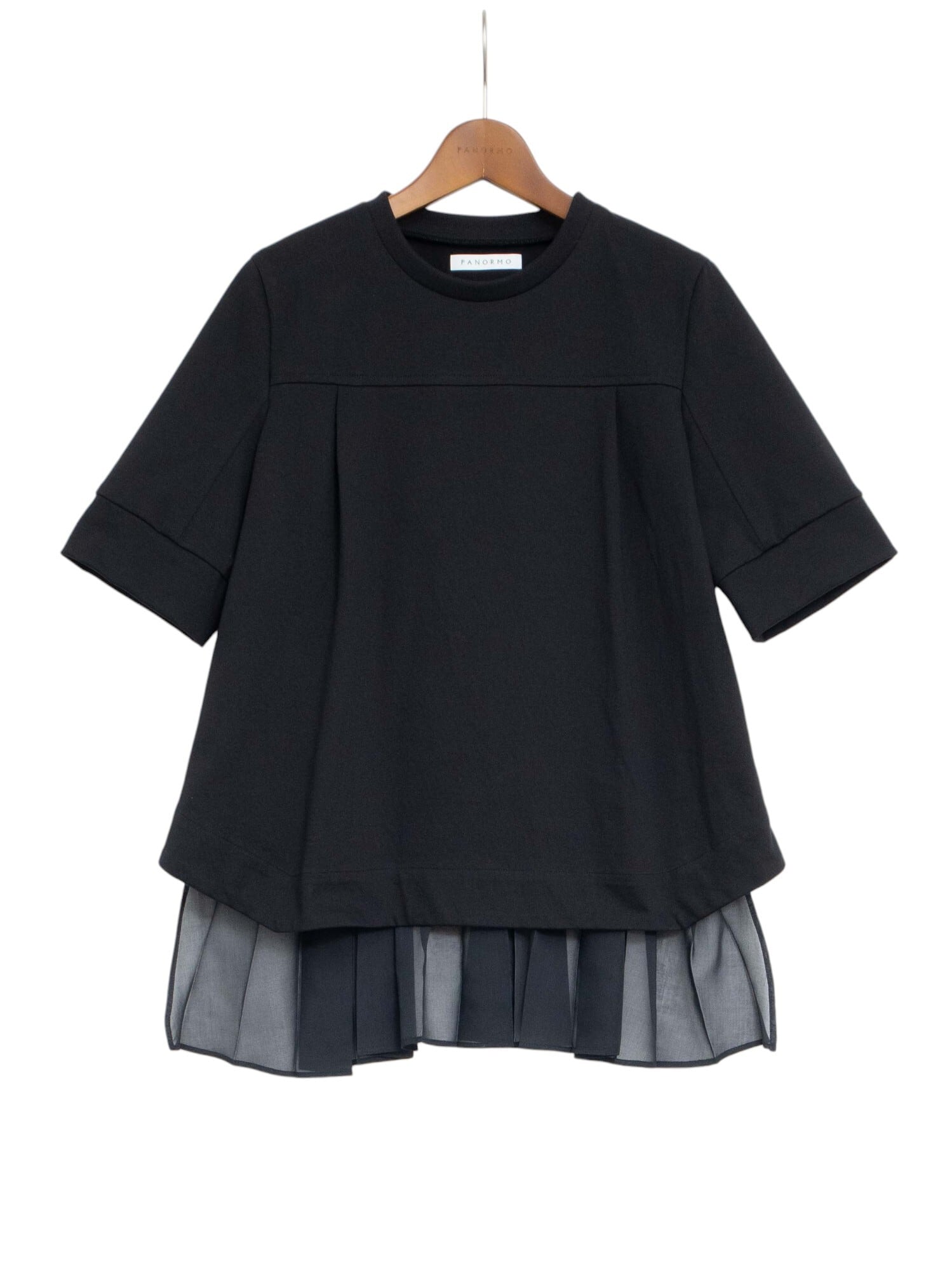 軽やかさで透明感のあるアコーディオンプリーツをバックスタイルにドッキングさせたデザインTシャツ。