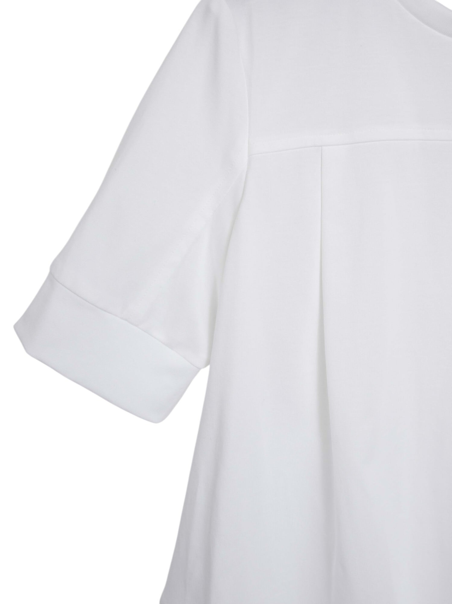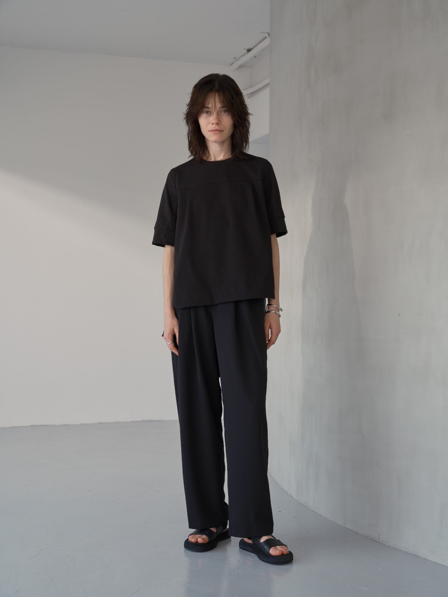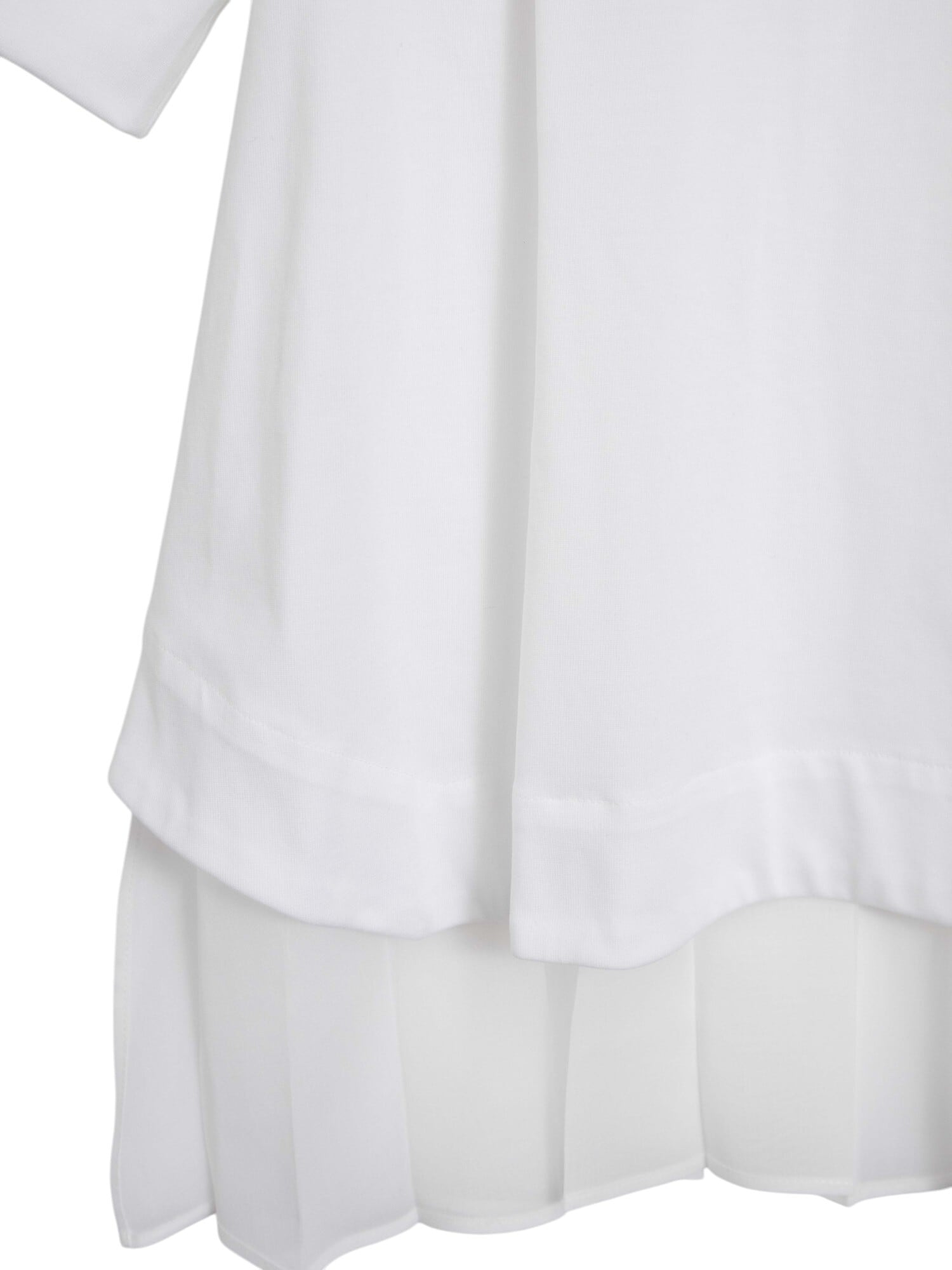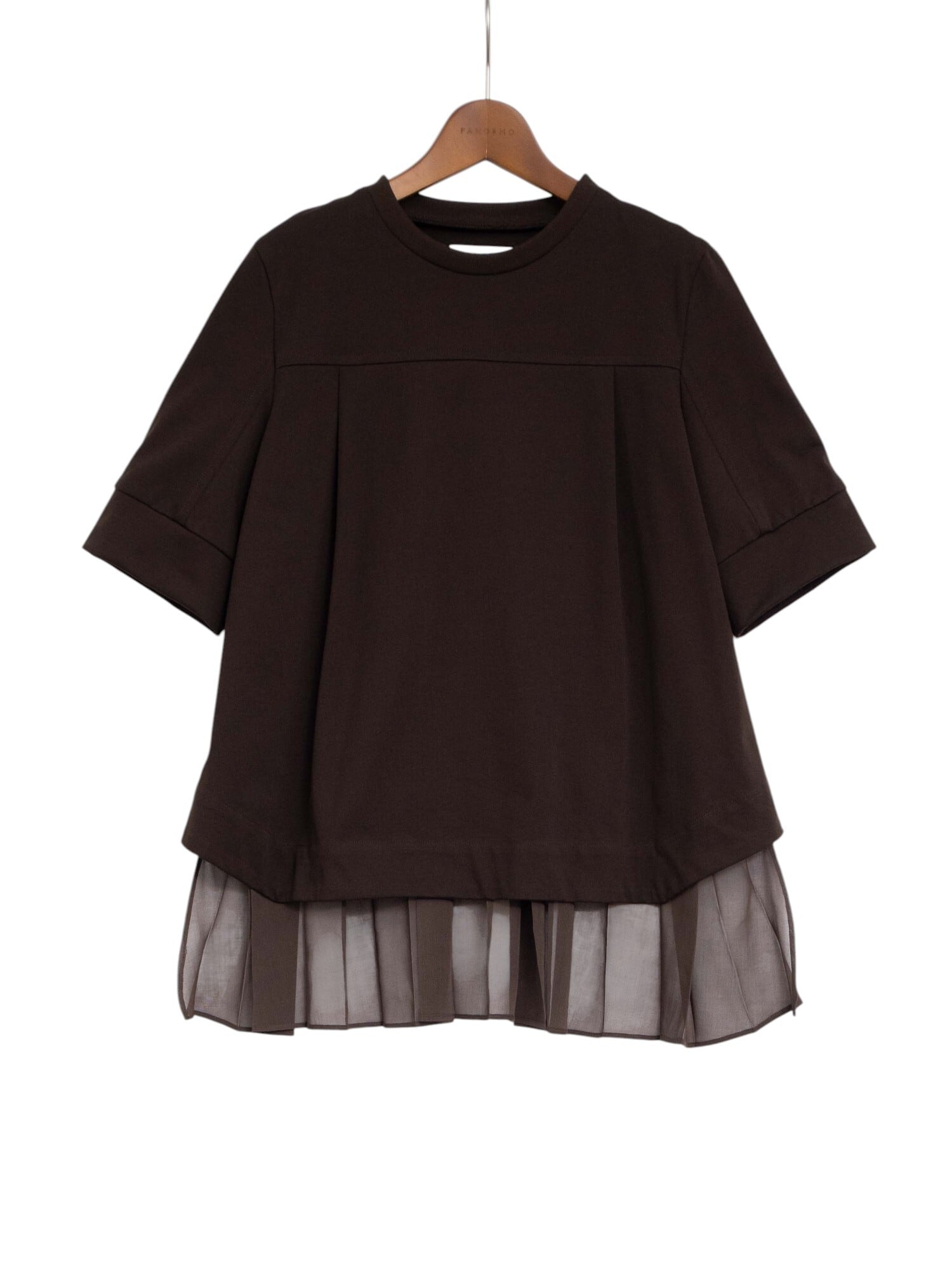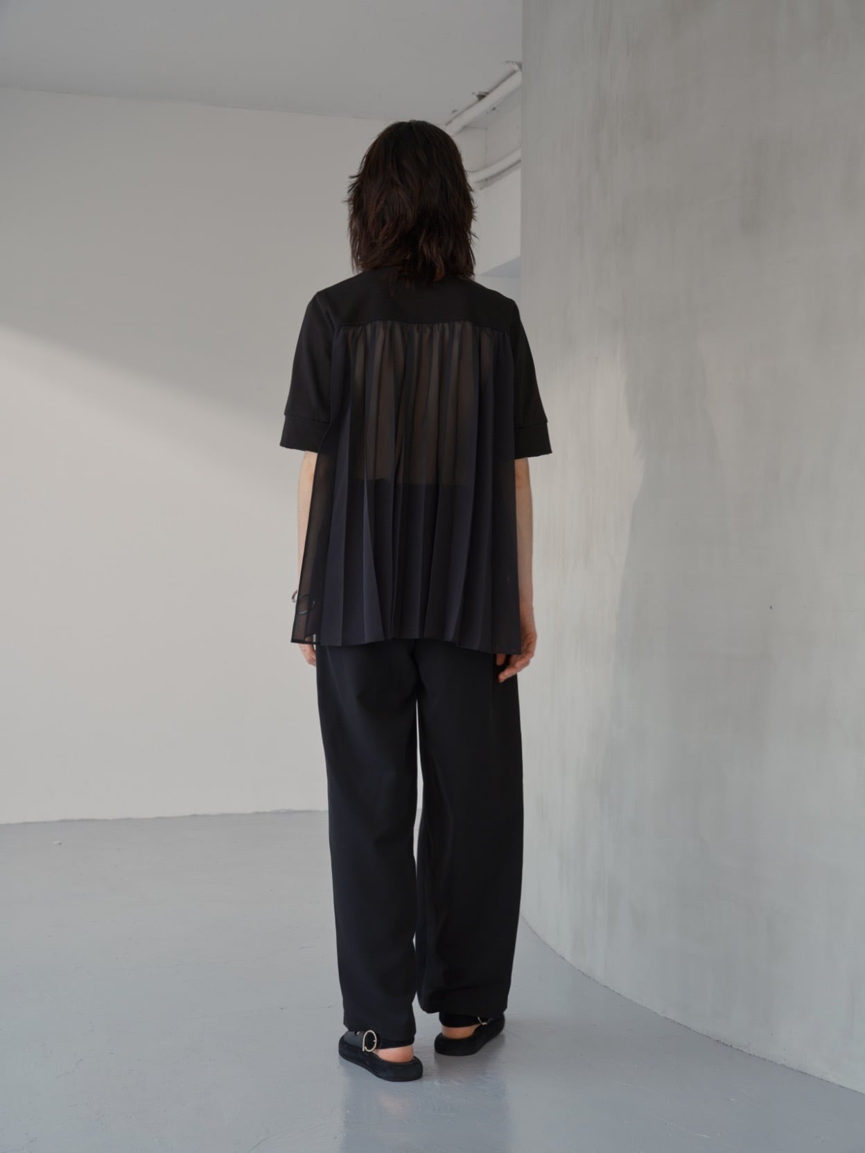 軽やかさで透明感のあるアコーディオンプリーツをバックスタイルにドッキングさせたデザインTシャツ。