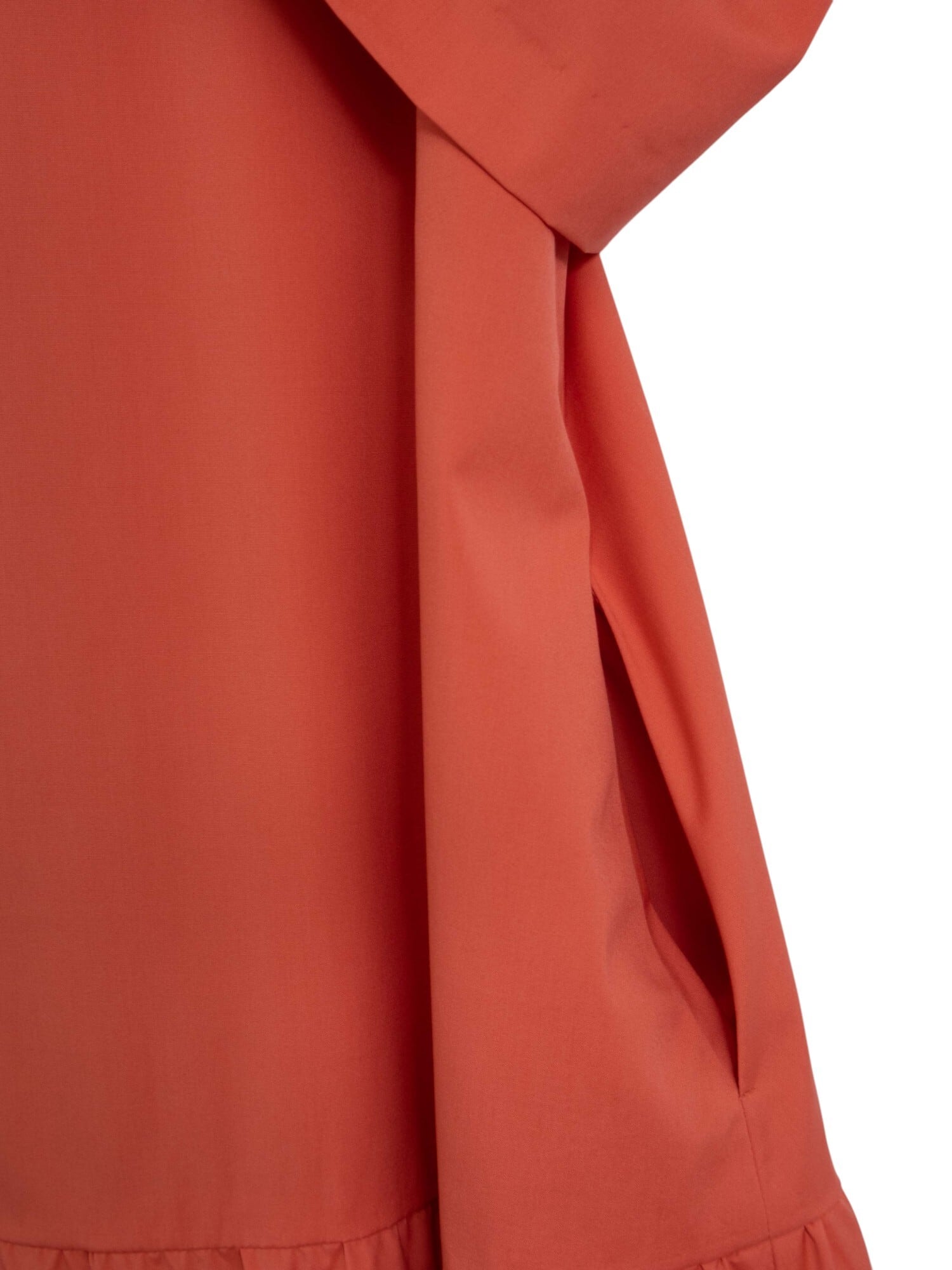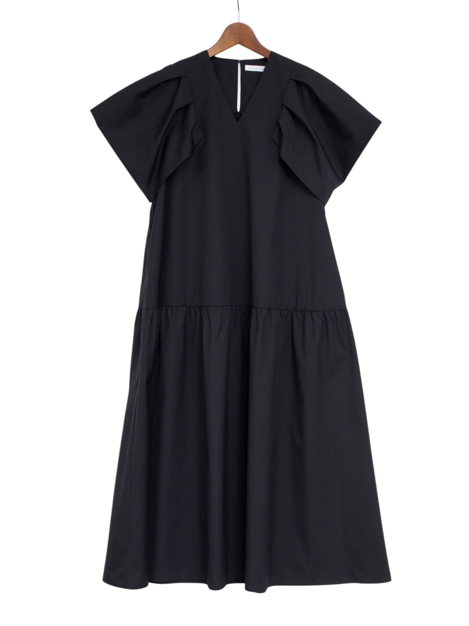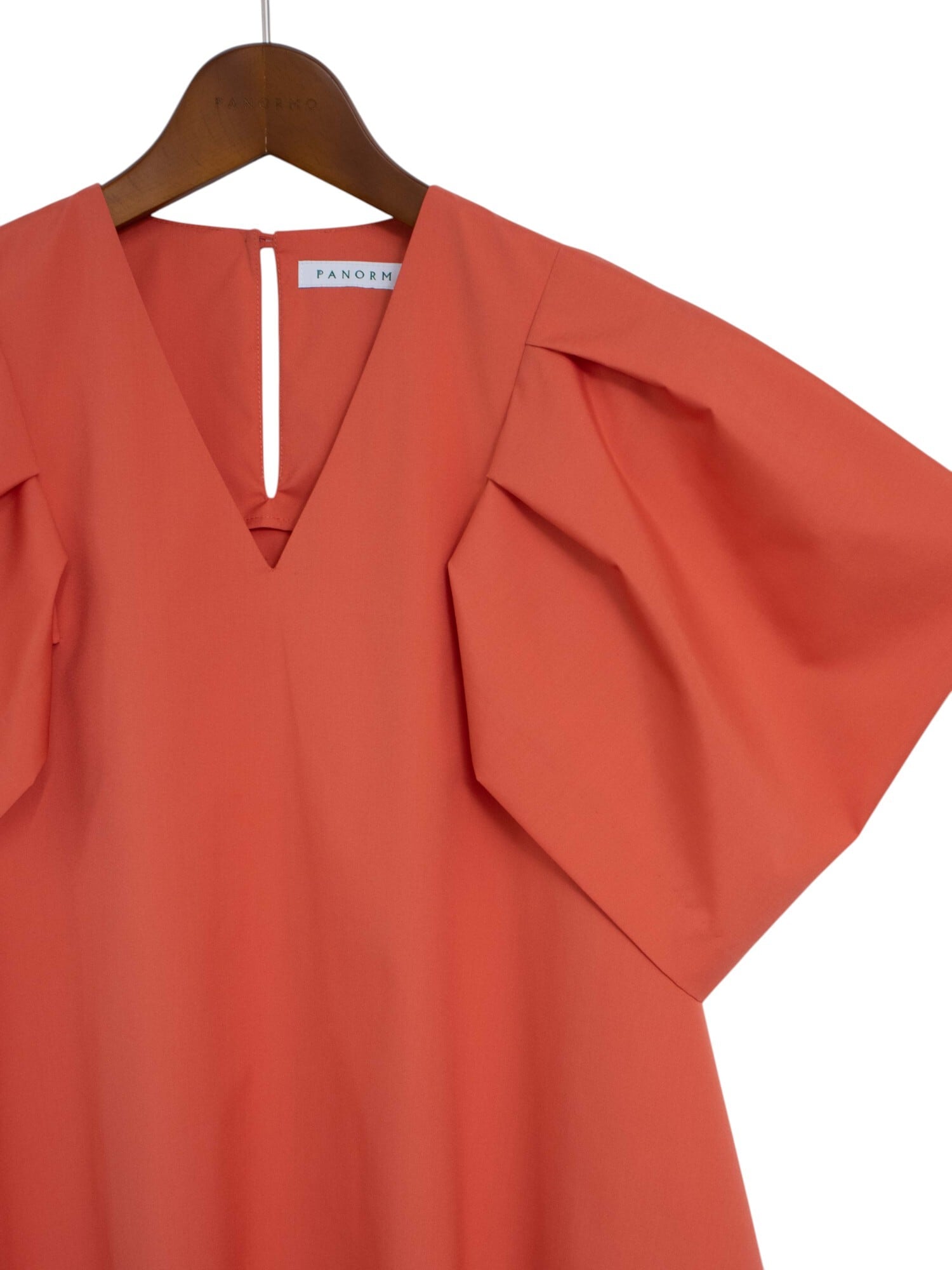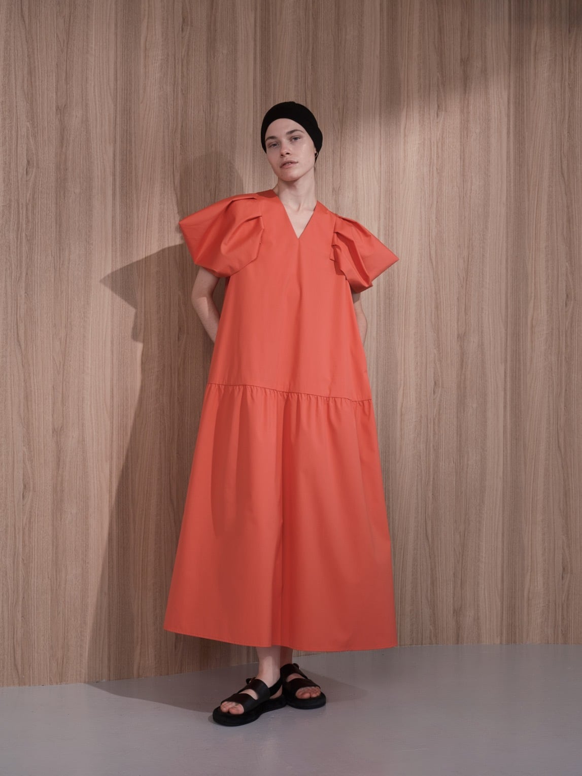 肩のタックデザインは内側から深く入れることで、肩を大きく見せず、エッジの効いたボリューム感を演出。