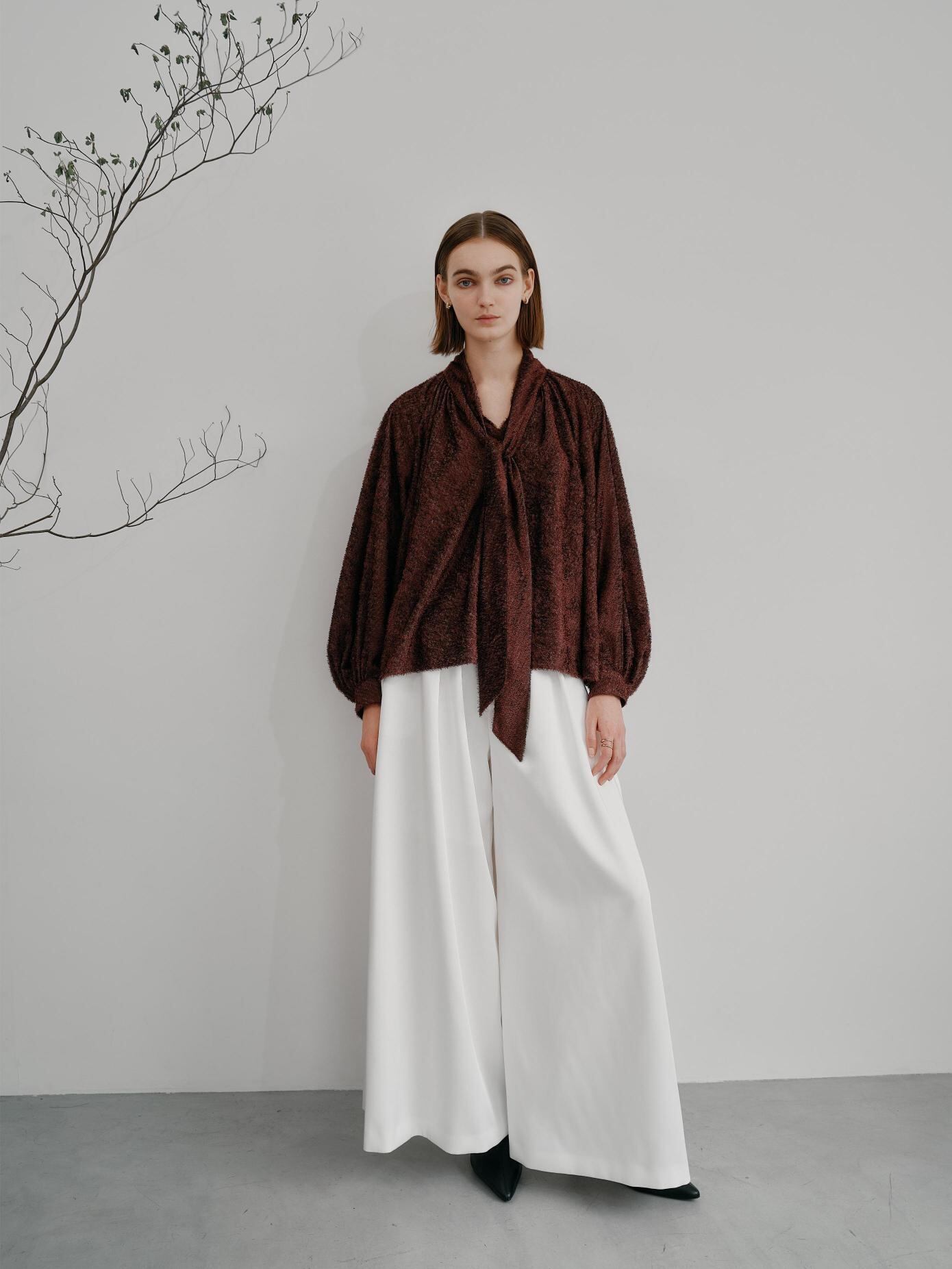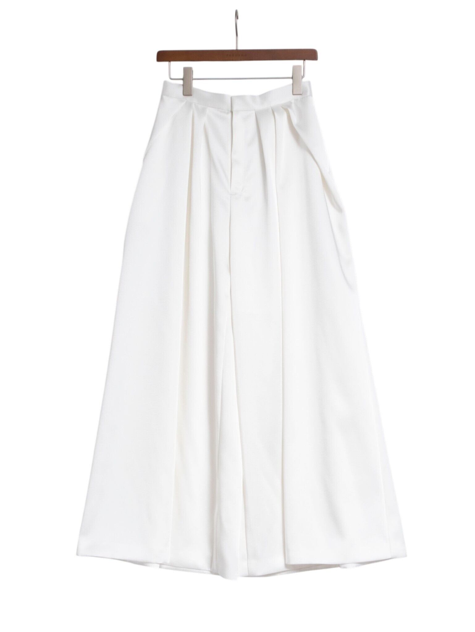 斜めに入れたタックが、歩くたびにさりげなくドラマティックな広がりを生み出すワイドパンツ。