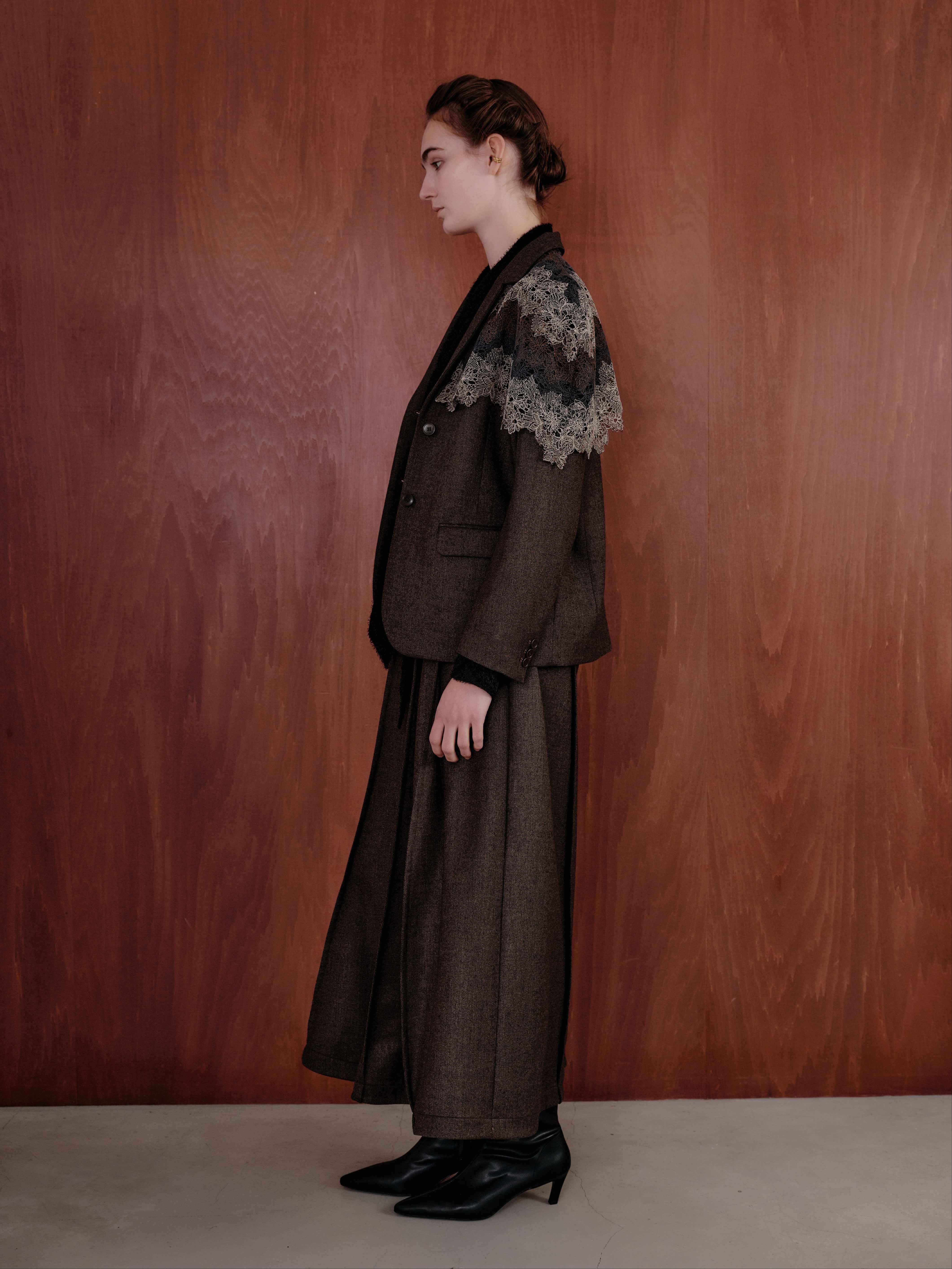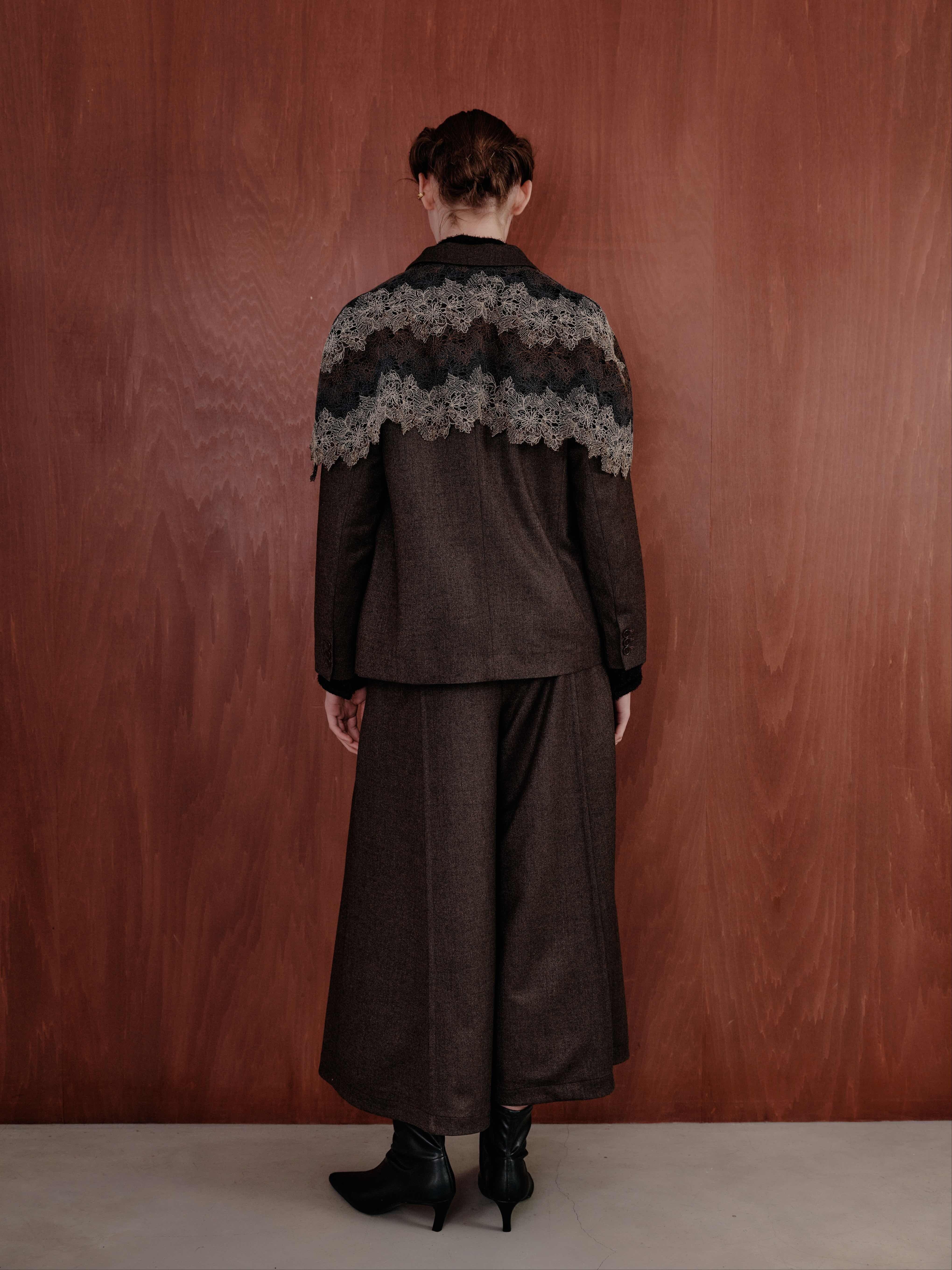 マニッシュなシルエットのジャケットに、取り外し可能なレースケープを重ねた印象的な一着。