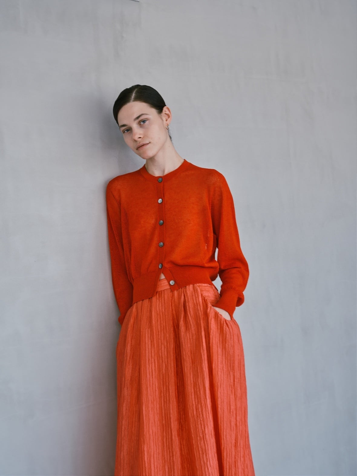 透け感を残し、少し甘めに編み上げたリネンとコットン、ナイロンの混紡素材のカーディガン。
