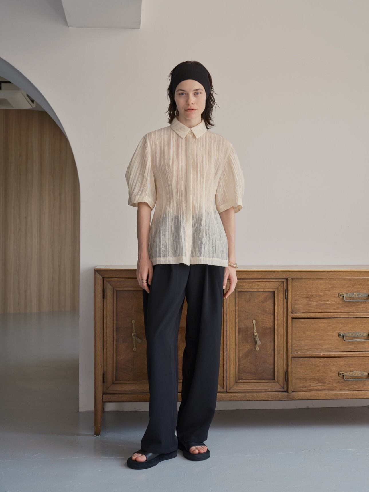 上品なシアー感と光沢、構築的なデザインが魅力のブラウス。