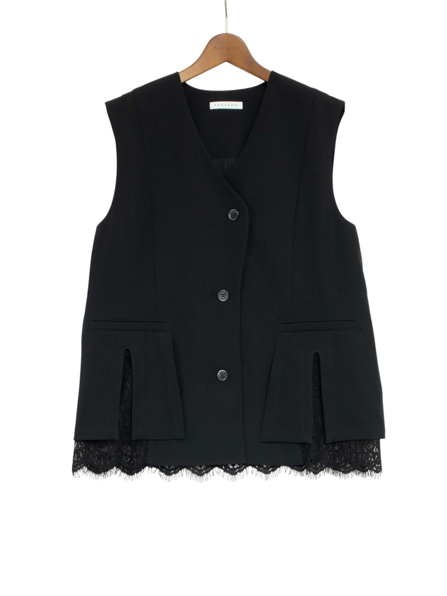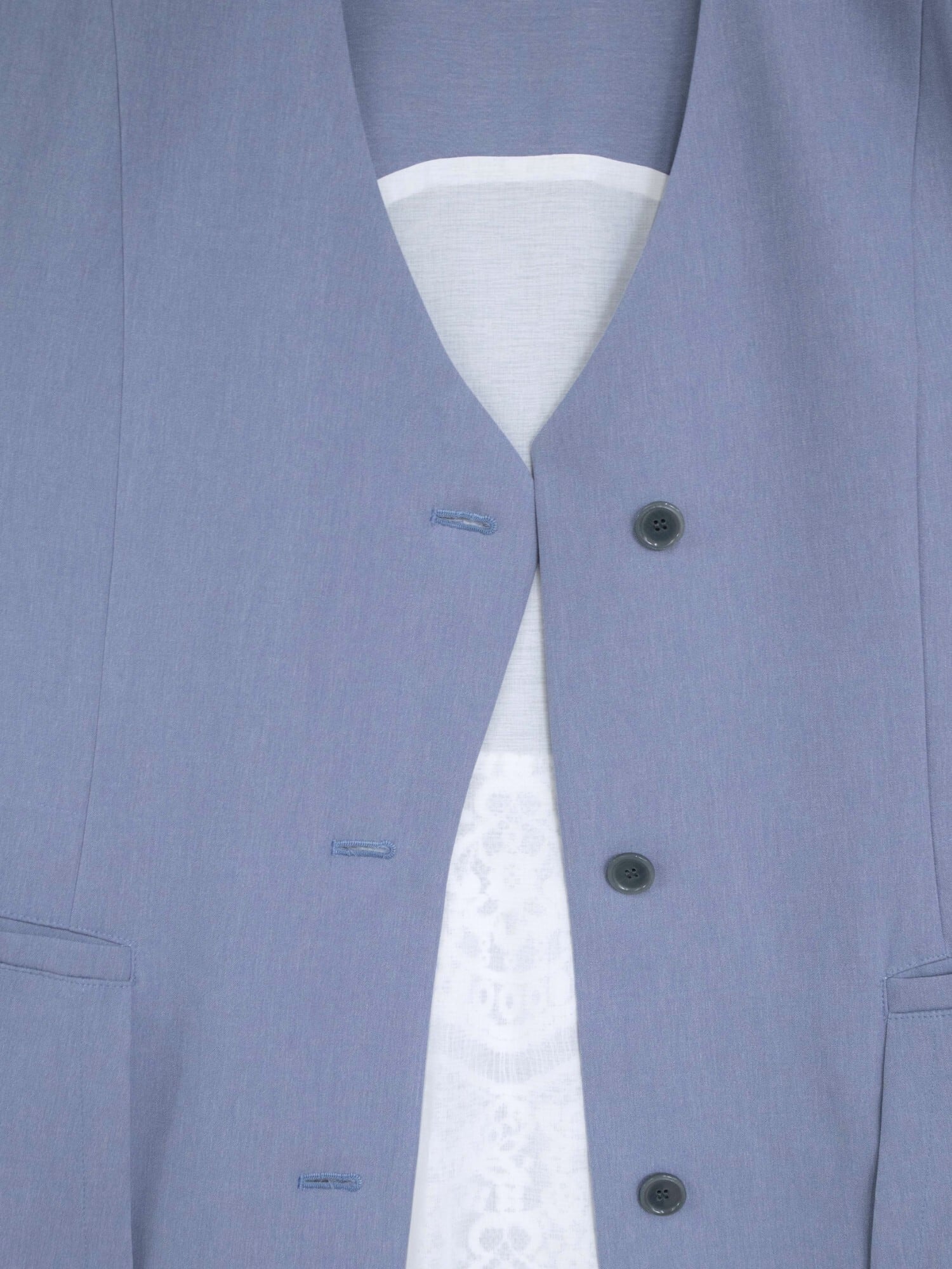 すっきりと開いたネックや3つボタンの端正な佇まいに、動くたび揺れるレースが軽やかなニュアンスを添え、静と動の対比を演出。女性らしい柔らかなカーブを描くネックラインが印象的です。