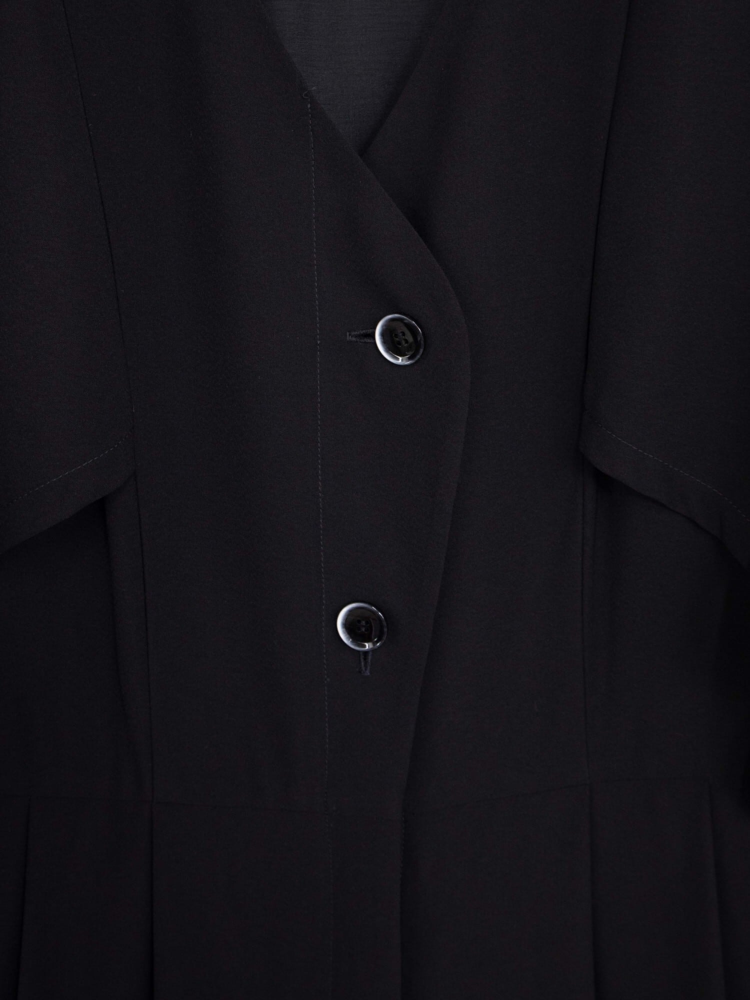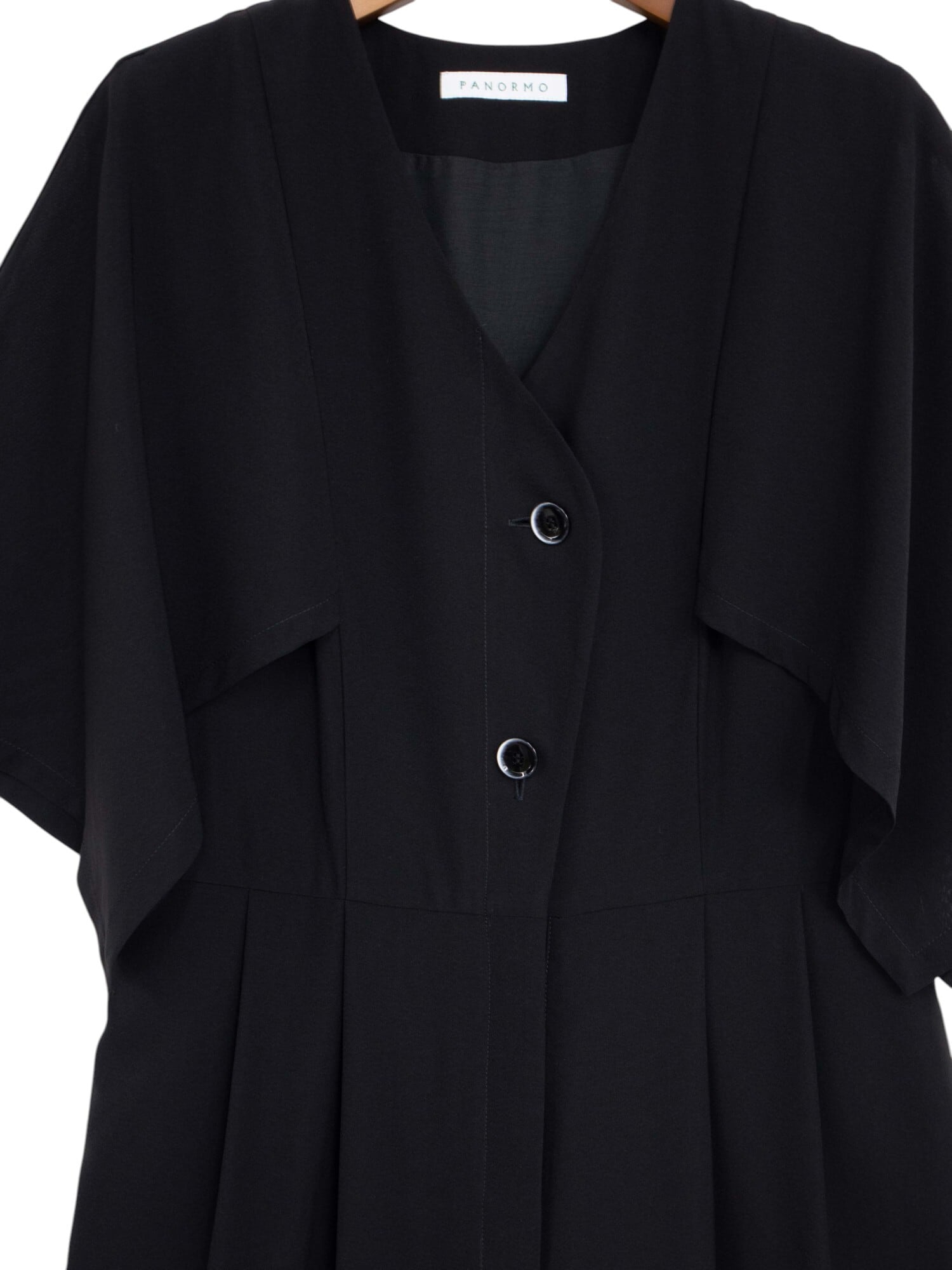 スクエアカットのマント風デザインが肩から背中にかかり、ふわりと揺れる動きが印象的です。