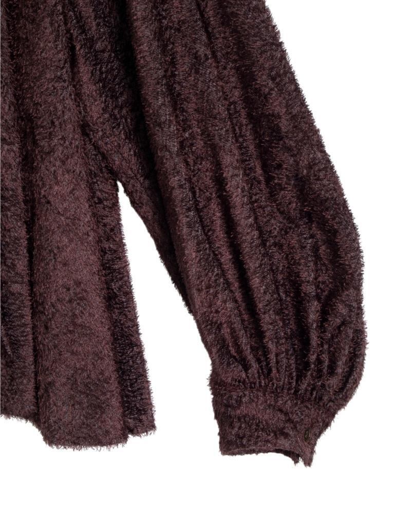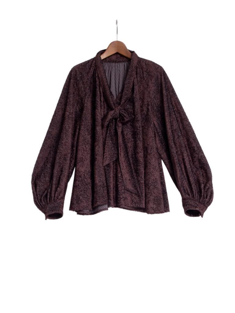 斜めに流れるような表情の毛足の短いカットジャガードが印象的なボウタイブラウス。