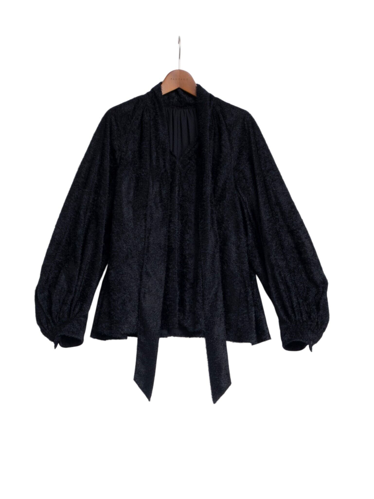 大きく開いた襟と、ボウタイのバランスは、リボンのように結んでも、あえて垂らしても、スタイリングに動きが加わり、シンプルに1枚で着ても映える存在感です。