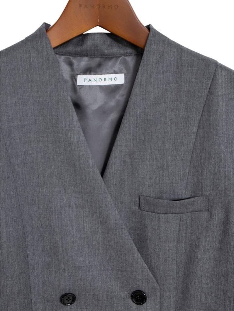 ダブル仕立てのマニッシュなシルエットととギミックの効いたデザインが印象的なジャケット。