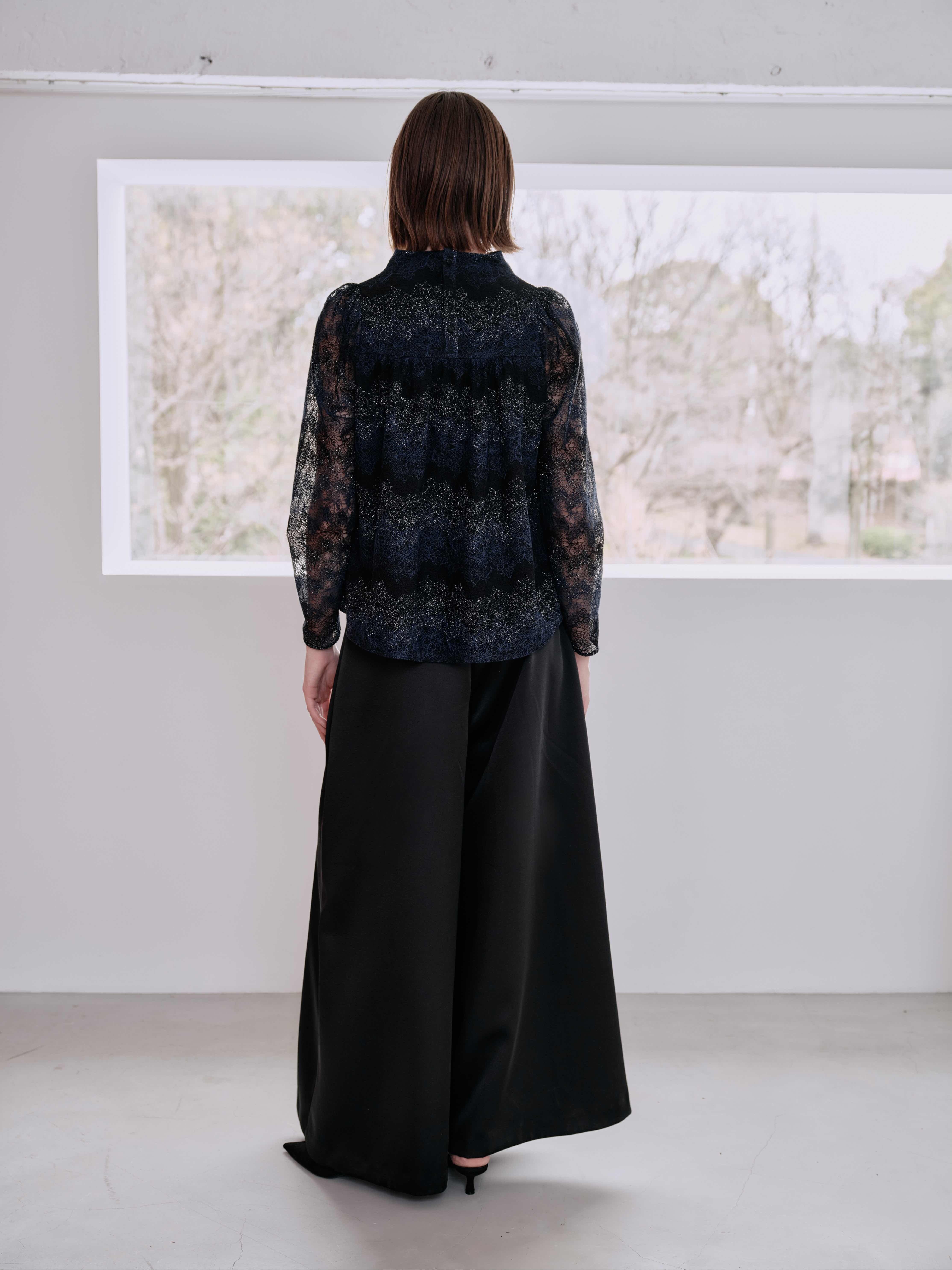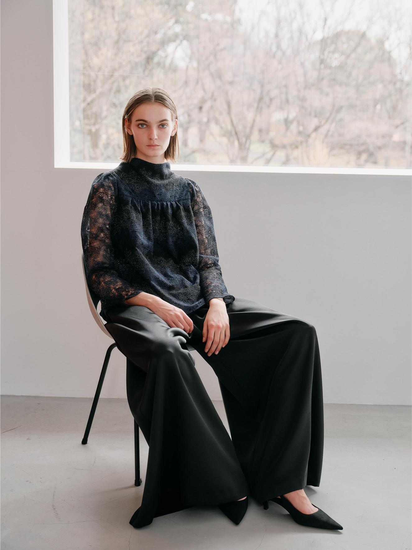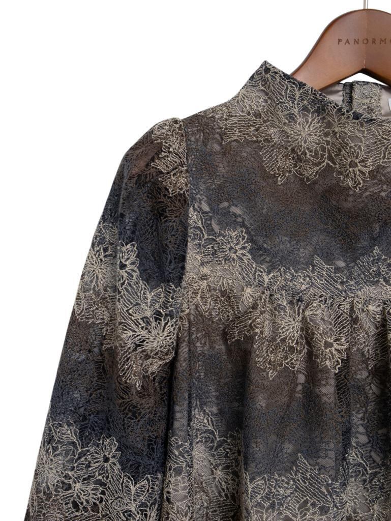 袖部分のみ透け感を持たせ軽やかさと抜け感をプラス。レースの透明感を生かすため裏地の代わりに光沢のあるヴィンテージサテンを使用。